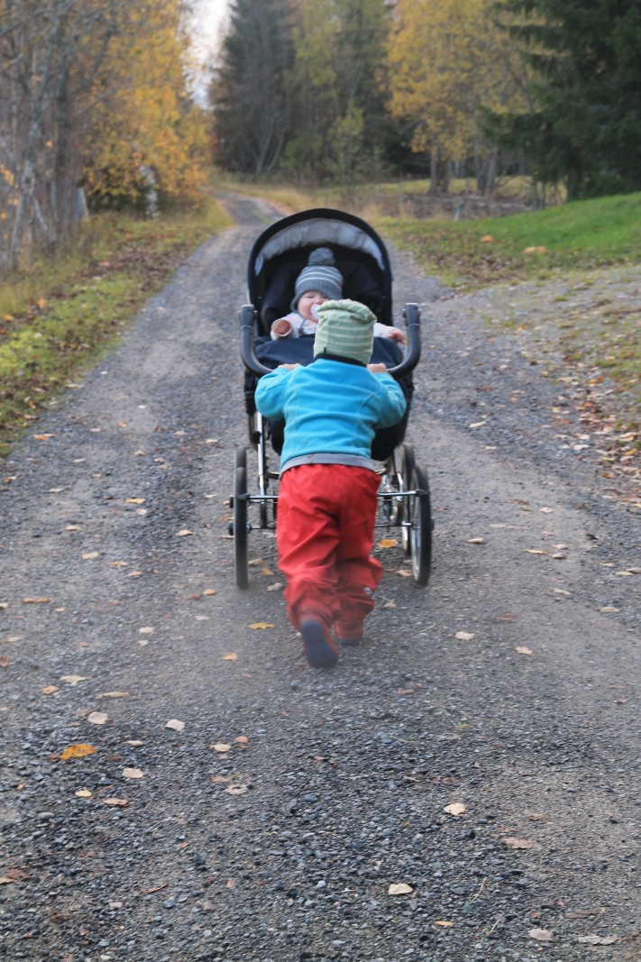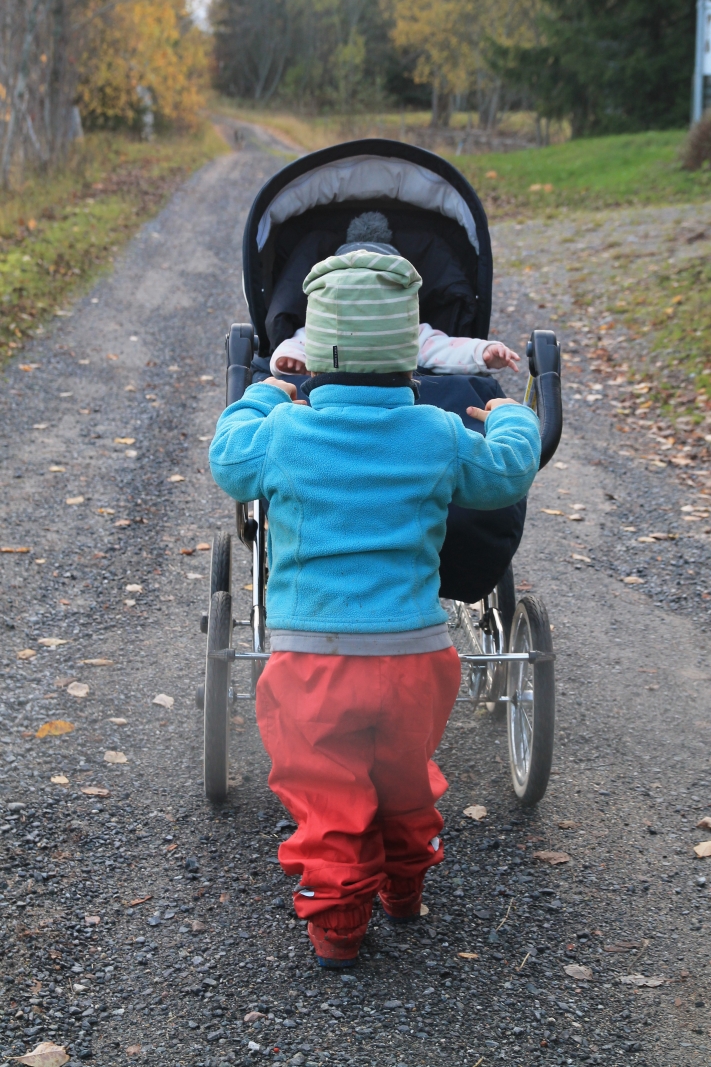 Typiskt, men en heldag med sol klagar vi inte över! Vi gick en liten prommis i alla fall. Med Lilla P gåendes och lillasyster i invigning av sittdelen på vagnen. Det gjorde lite ont att bära upp liggdelen faktiskt. Jag som är så galet bäbis-bäbis-kär tycker såna saker är jobbiga. För detta betyder att jag inte har en liten spädis längre…