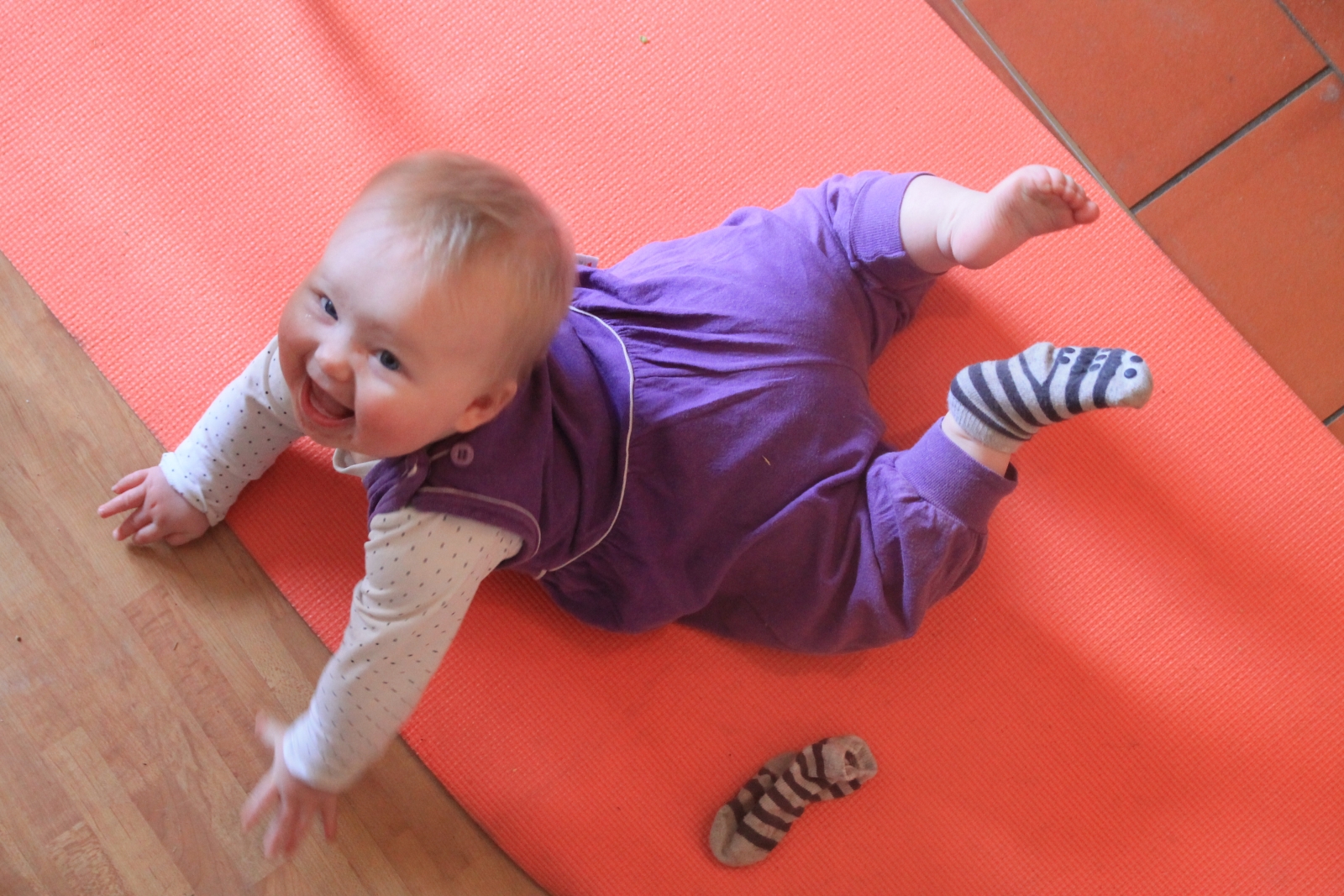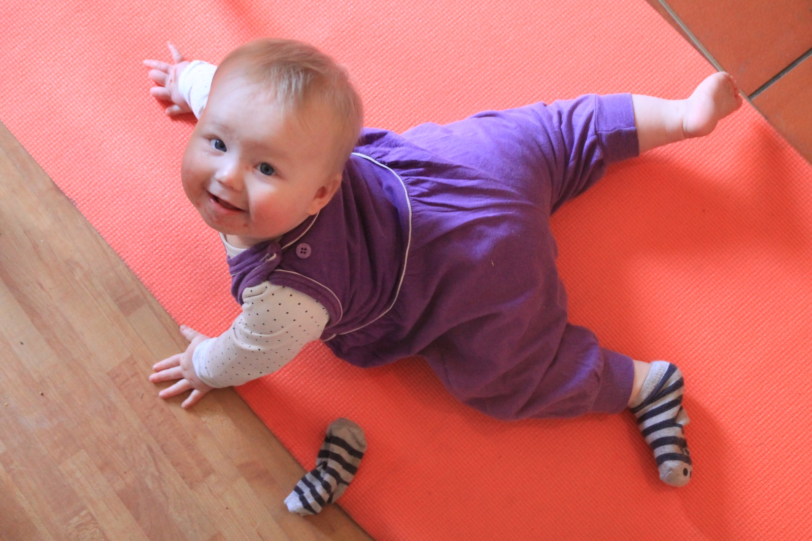 Lillsnoffsan i mammans gamla hängselbyxor. I ett försök att få bättre fäste under knäna för den där krypningen som ser ut att vara på gång när som helst så tog vi fram träningsmattan. Det blev magplask ändå. Men det rör sig framåt på nått slags halvkrypande vis ändå här hemma ändå nu.IMG_1904