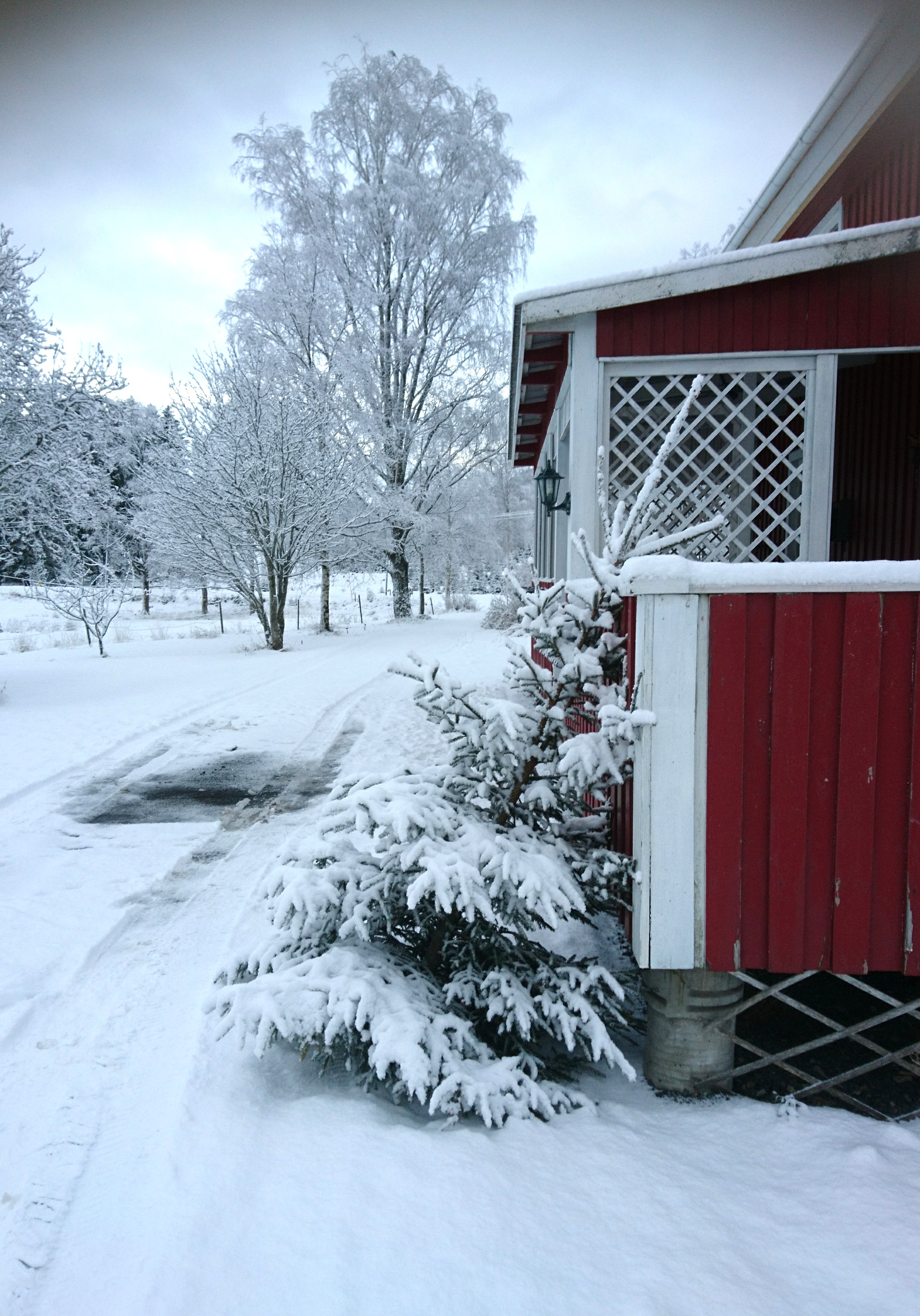 Där står den, årets gran. Vacker i ett snötäcke. Så glad för att snön kom tillbaka igår och vi har ett vinterlandskap igen efter att det regnat bort för ett par dagar sedan.