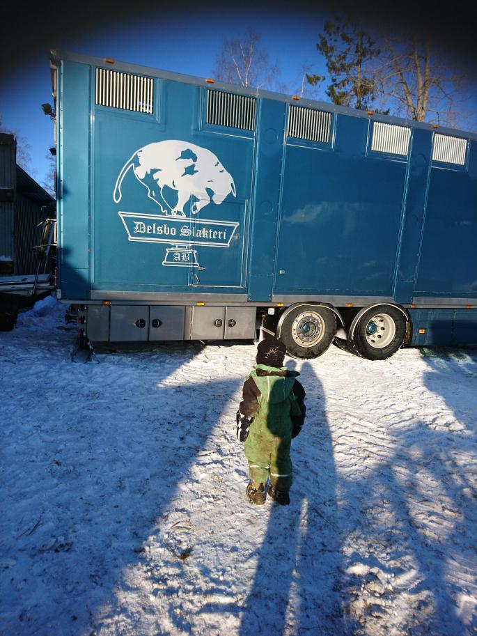 Och imorse, eller då det fortfarande kan kallas natt, så åkte C iväg för morgonmjölkning igen. Vi klev upp lite mera morgontid och inväntade svägerska med familj som skulle komma och vara inne med barnen då slaktbilen kom. Men istället kommer slaktbilen nästan en timme för tidigt! Bara att packa på barnen kläder och ta sig ut. Tänkte att detta kan bli lite svettigt, lasta en helt gäng djur och ha koll på två små kids samtidigt.
