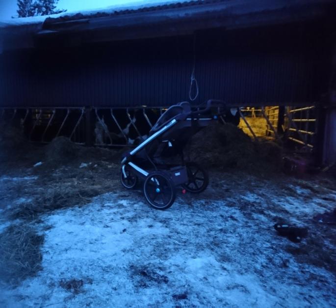 Vi började förmiddagen med att gå ut allihopa och halma i lagårn.Stumpan hade vaknat på fel sida så hon fick köra förmiddagssovning i vagnen medan vi andra tre jobbade på.