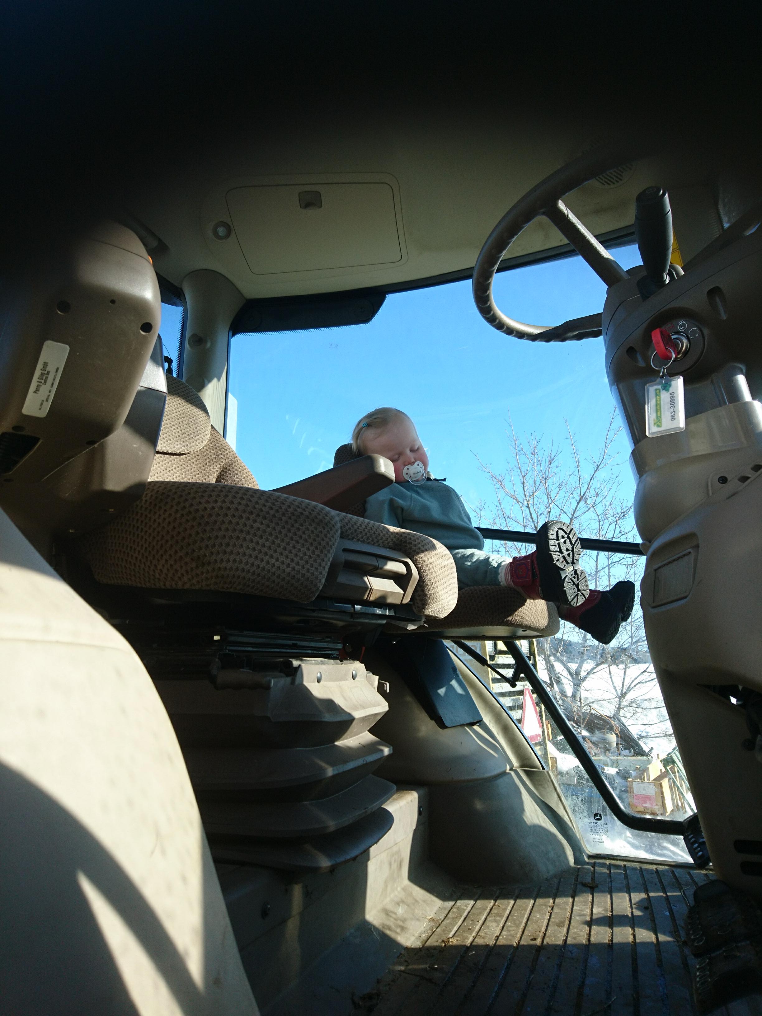 In i bilen igen, en snabb tur på affärn och så hem. Klädde Lilla P i lagårdskläder och ut till pappan medans tjejerna hoppade in i traktorn för att åka och laga slangen.