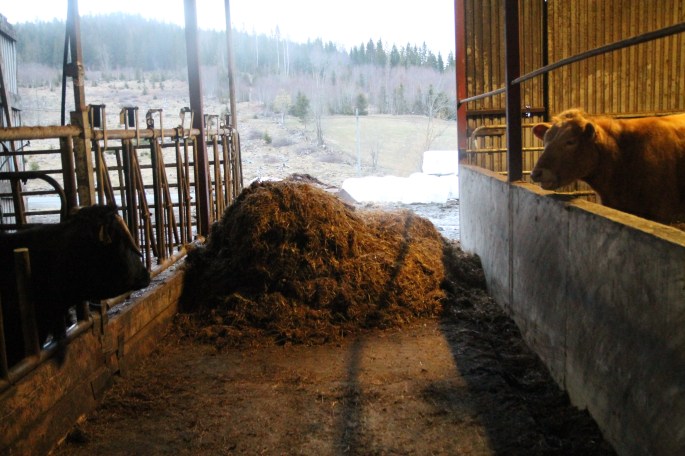 Tjurar och kor på ”VIP-avdelningen” behövde matpåfyllning. Då det varit is precis utanför där man ska köra in så har man knappt kommit in med traktor senaste dagarna. Det är så himla smalt också att man inte har så mycket att spela på och ta sats och så så vi har bara ställt en bal längst ut och så handskottat in till alla djur ett par dagar.