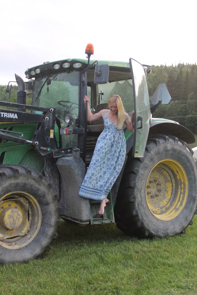 Och klänningen fick vara på hela kvällen. En stund i traktorn med C som visade en extra gång på grejerna då det är jag som ska slå det sista imorgon.