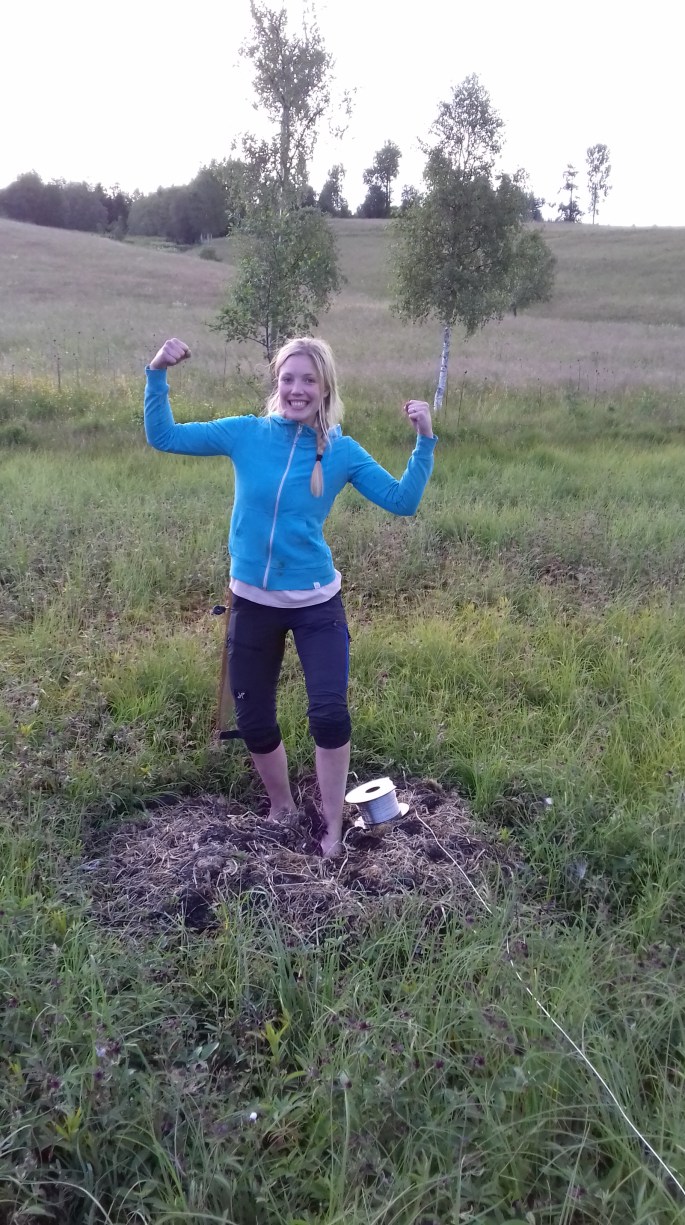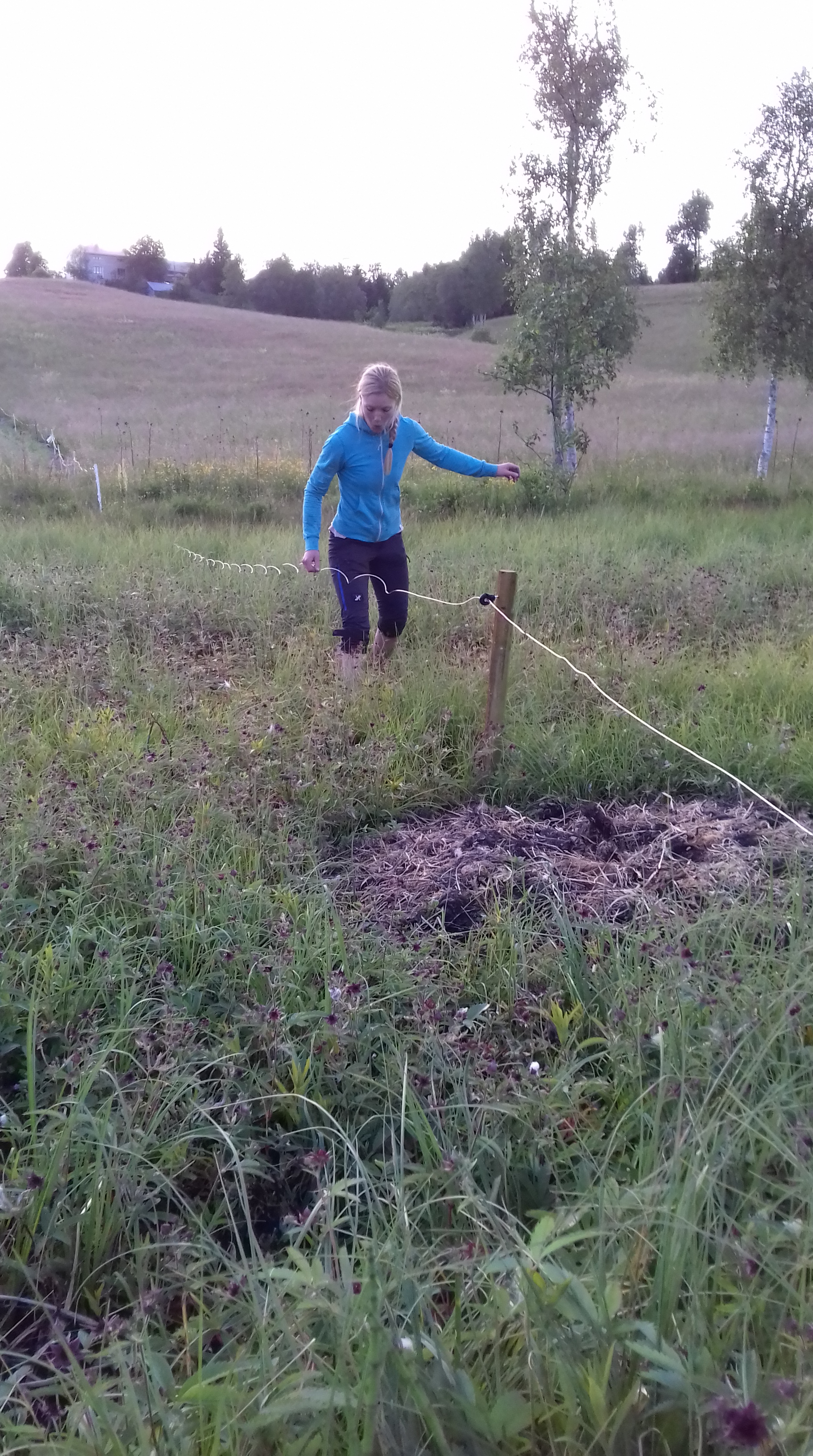 Men sen insåg jag att det där svajiga gräset låg som en kaka som bar mig! Så jag gick med försiktiga steg in med tråden en bit och satte en stolpe till.