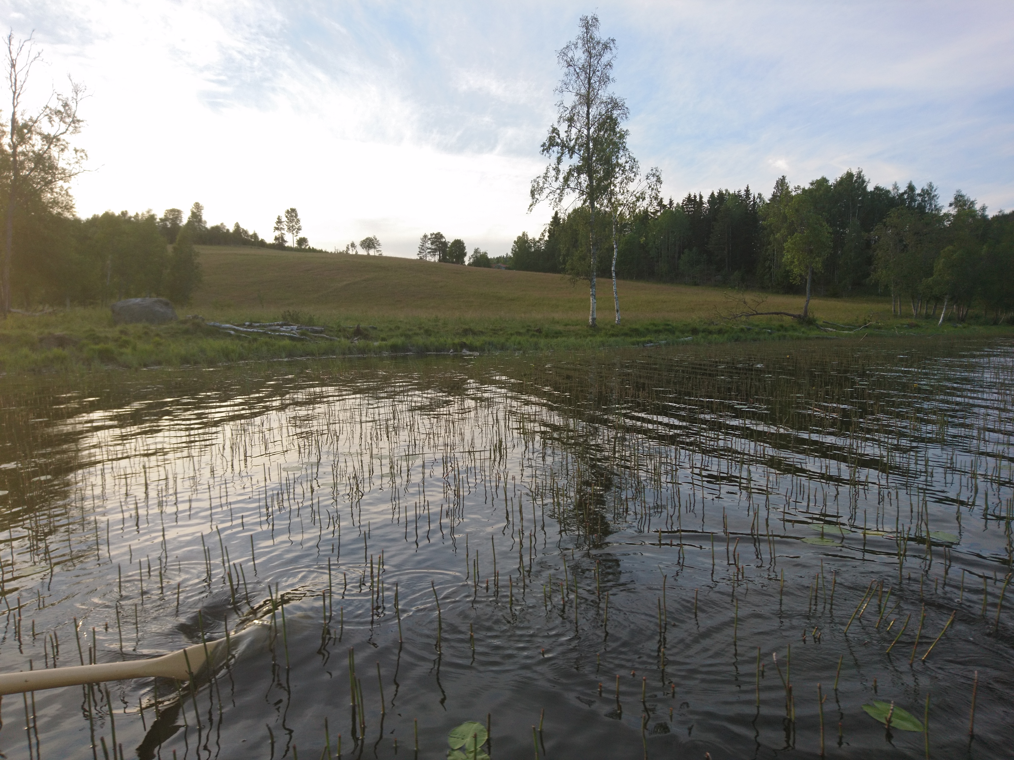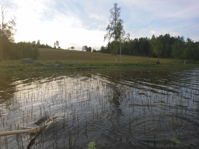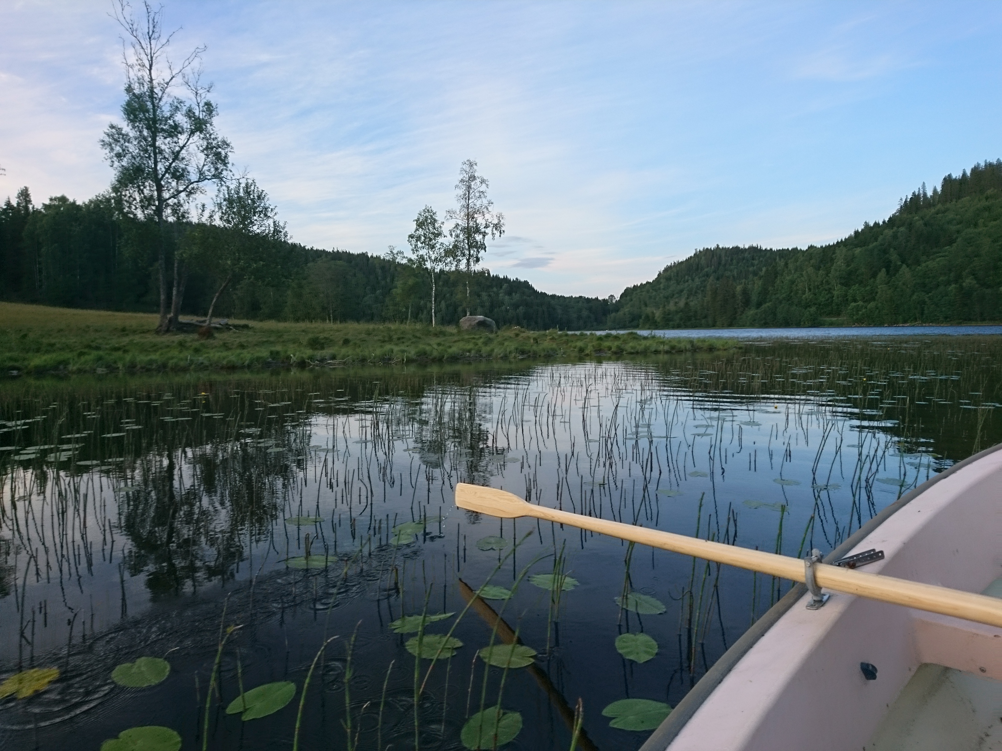 Farfar Hans och jag gick ner till grannens båt och rodde ut. Så länge sedan jag satt i en liten eka?! När vi var mindre rodde vi ofta över sjön för att bada. Konstigt nog så finns det ETT ställe på vår sjö som har sandbotten, resten är bara dy och lera och man sjunker ner till knäna. Gissa hur gärna jag och min syster velat ha badstrand bara nedanför gården? En presenning på botten pappa! Och sand! Och en brygga!