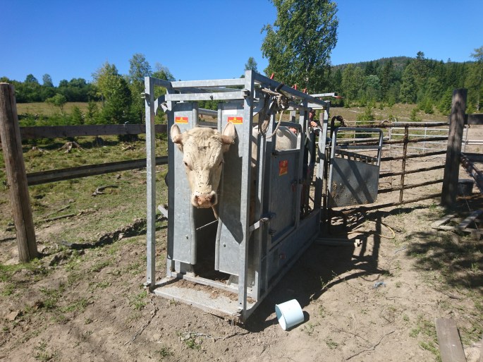 Den halta tjuren fick veterinärbehandling igår för klövspalt. En svullen fot som inte verkade ge med sig så nu ska ha in här och få penicillin en gång om dagen i fyra dagar. Klövspalt är en inflammation i klöven som gör ont och måste behandlas. Vad glad jag är att vi gjorde uppsamlingsfållan på hygget i fjol och att vi har den här behandlingsboxen. Suverän till så mycket! Pappa kom och hjälpte till att få in han när veterinären kom, tur de har semester.