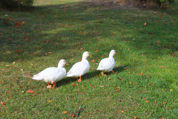Det var tre vita små figurer som sprang fritt på gräsmattan. De hade alltså lyckats ta sig ut ur deras lilla hägn. Men de verkade hålla sig runt gården så de fick vara ute hela dagen och utforska hemmamarken.