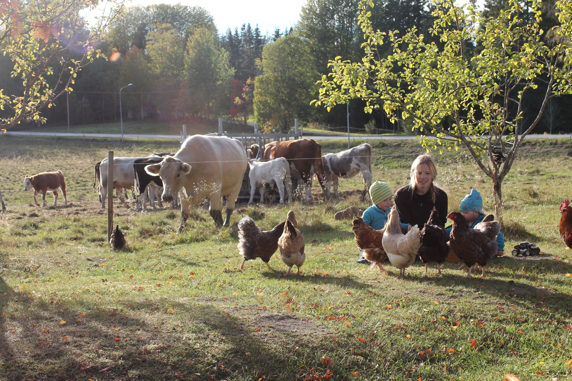 Vad jag älskar att bo såhär. Öppnar dörren och där går kossor och betar, fjäderfän i flera former på olika ställen, i finfin bur för de yngsta, älskat ankgäng som kvackar på en och så de fritt gående hönsgänget som alltid kommer springandes emot en när man kommer och går.