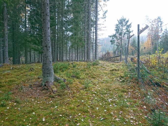 Det är enormt stort detta hägn. Flera lägdor och en massa skog. Bara att börja knata runt. Och såklart, läängst bort, innan det viker av tillbaka hade ett träd fallit, förmodligen efter stormen som var så stängslet låg nere så gänget bara kunde kliva över.