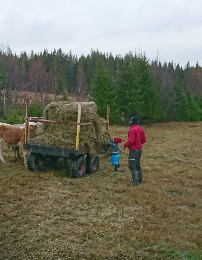 Älskar denna lilla gulliga vagn som C fixat ihop av en skogsvagn. Perfekt, flyttbar foderhäck ju!