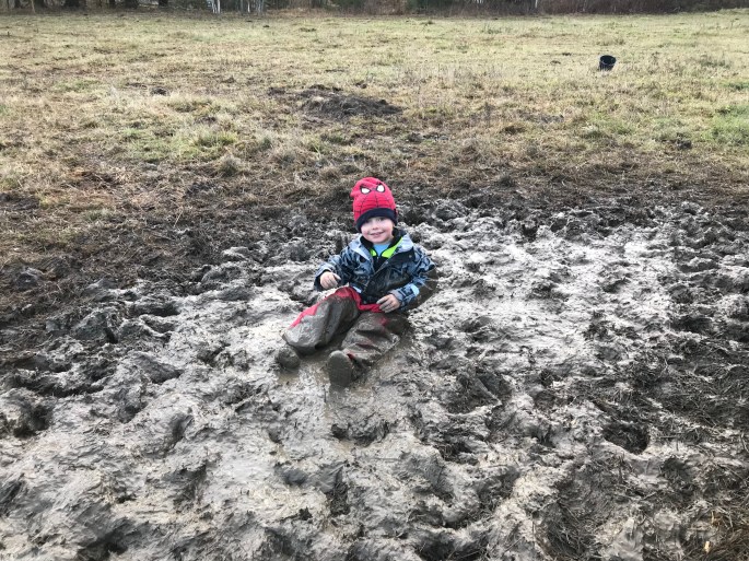 Lite mindre bra gick det för Lilla P då han stöp och ramlade på det härligaste stället där bredvid foderhäcken innan vi skulle åka hemåt… De där ytterkläderna fick åka tom kraftfoderhink tillbaka i traktorn kan jag säga!
