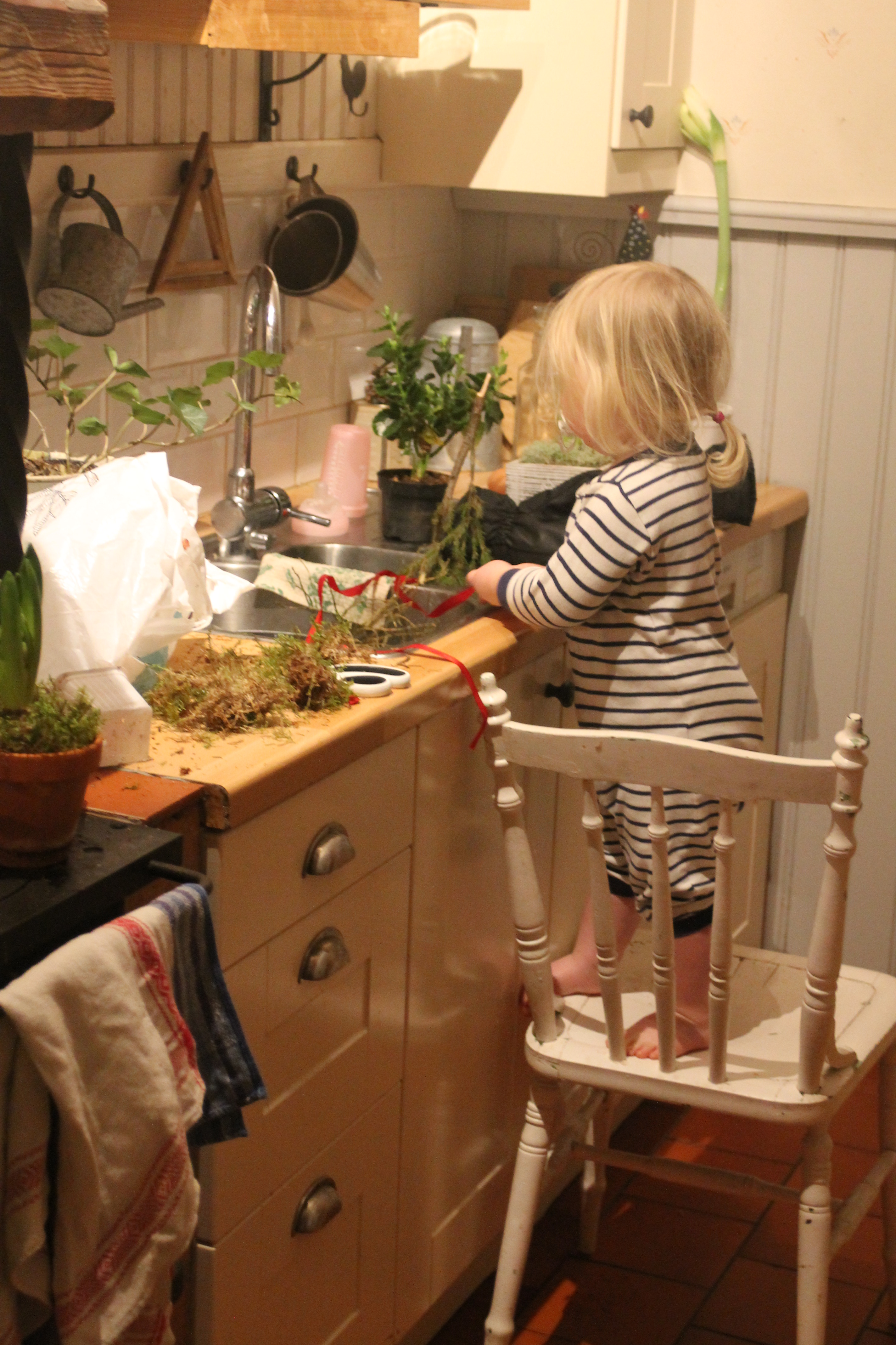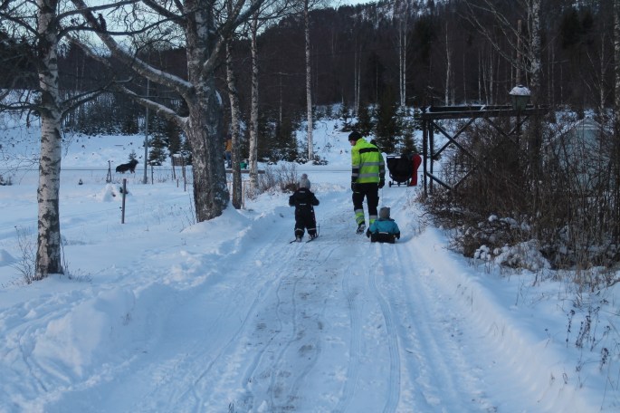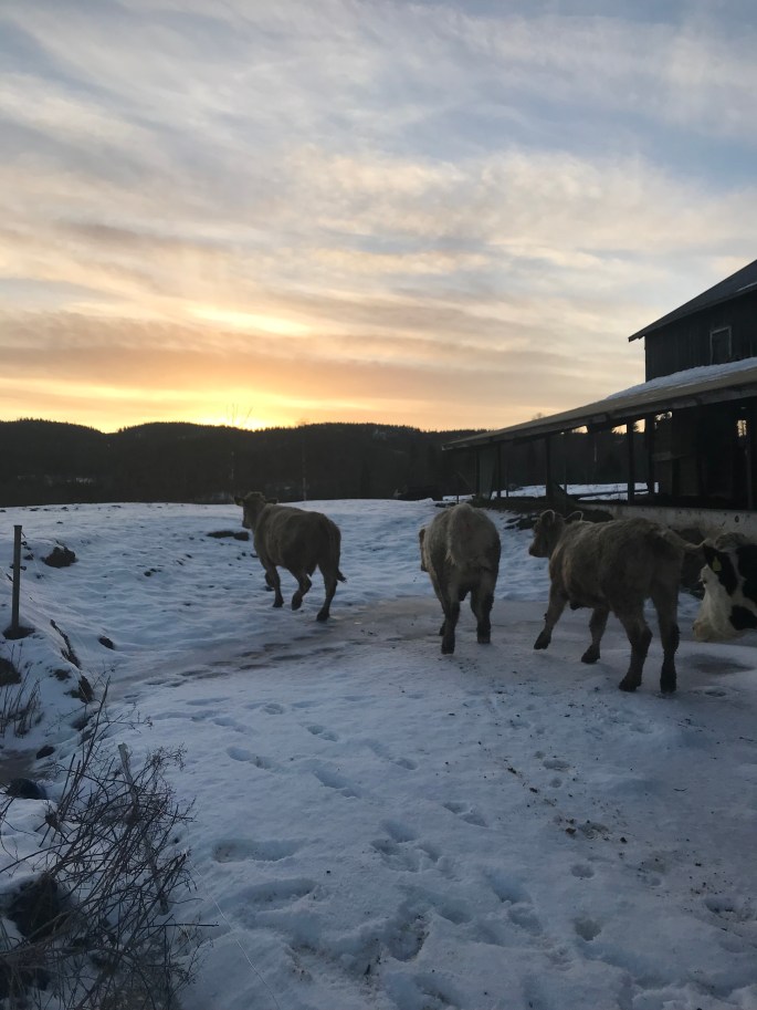 Lillasyrran sov i vagnen och vi hjälptes åt att sortera om lite djur. Separera ko och kalv som gått tillsamman i sex månader bla. Tre tjurkalvar som skulle flyttas över till tjuravdelningen och det gick fint så när som på en tjur. Helt knäpp i huvudet! Ibland dyker det upp såna knäppisar som är så stressade och förvildade att de knappt går att hantera. Man kan ju det här med att styra kor och kan i de flesta fall läsa av deras nästa move men dessa har inget vett och är såna som faktiskt springer över dig om du står i vägen (annars viker kor åt sidan om du visar dig starkast)! Då denne unge herre bara är sex månader så provade jag att ”vinna” i rang och inte flytta på mig när han kom och sprang på foderbordet (dit han hade hoppat igenom en grind för att komma!) men han sprang alltså på mig och trots att han ser liten ut så är det ändå ett par hundra kilo muskler i full fart så HAN flyttade på MIG om man säger så. Men ingen fara, det var ju ”bara” en kalv och ingen gjorde illa sig.