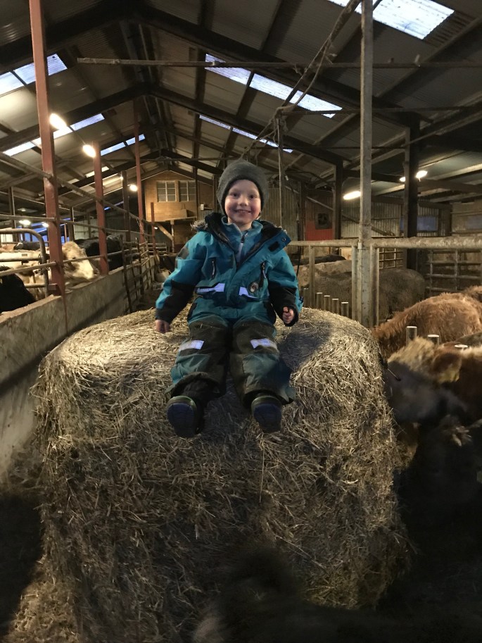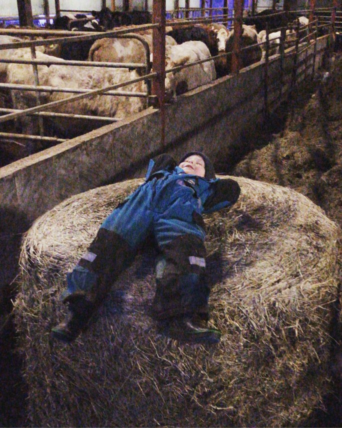 Jag och Lilla P bytte om och gick till lagårn där tjurarna behövde nya balar.