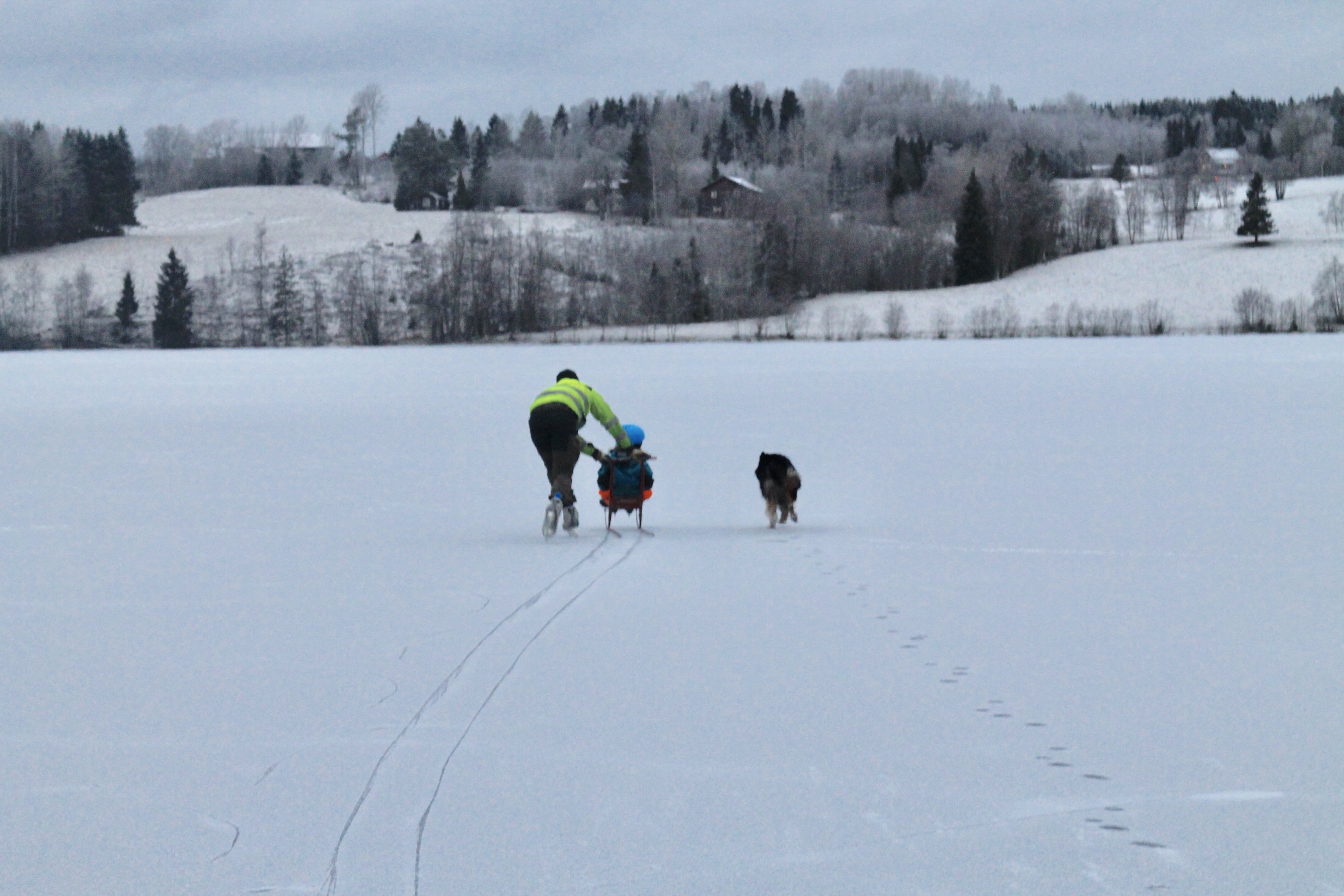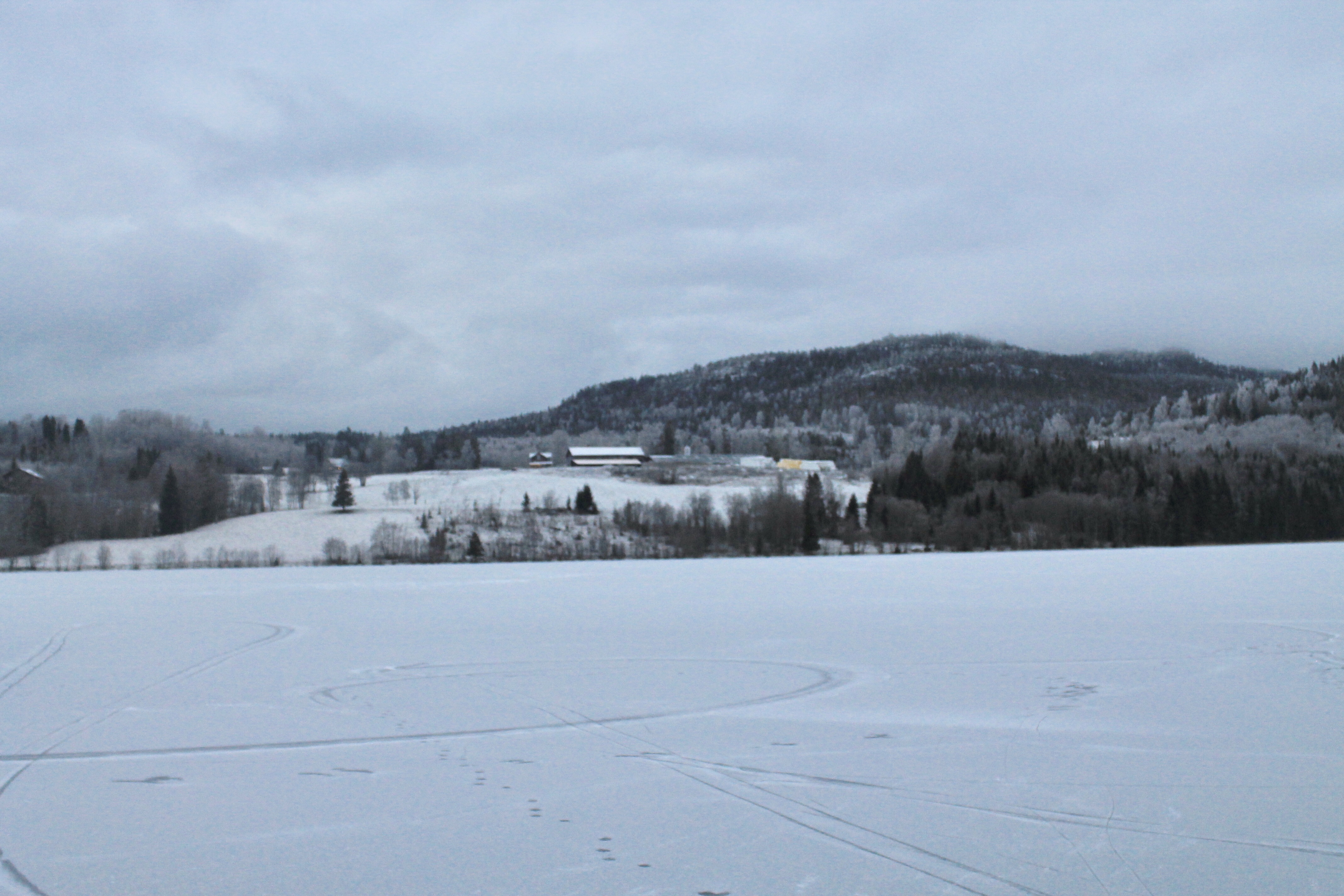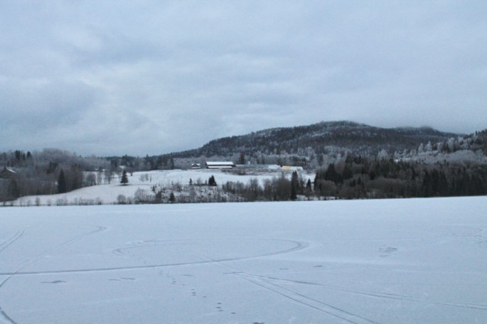 Det snöade några millimeter på förmiddagen, vilket var perfekt för oss utan skridskor som gav lite lite fäste för skorna. Helt lungt och tyst omgivna av det blå/grå skogarna.