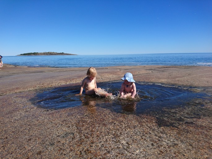 Det blev några svalkande dopp både hemma i sjön där vattentemperaturen var så härlig att till och med jag badade! Och en tur till Rotsidan i roliga pölar (men detta var mest svettigt för mamman som hade smått panik för de små på hala klippor..!).