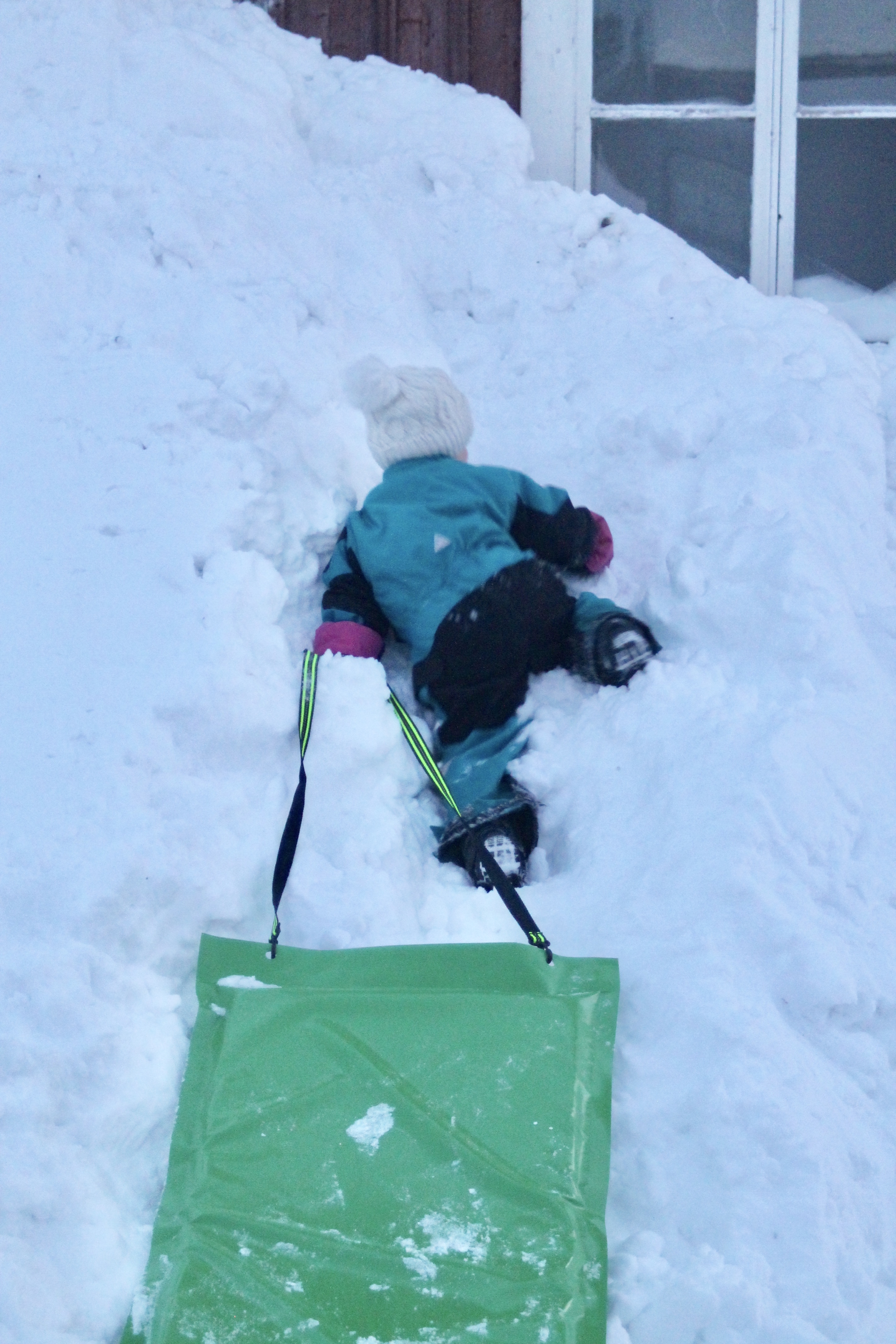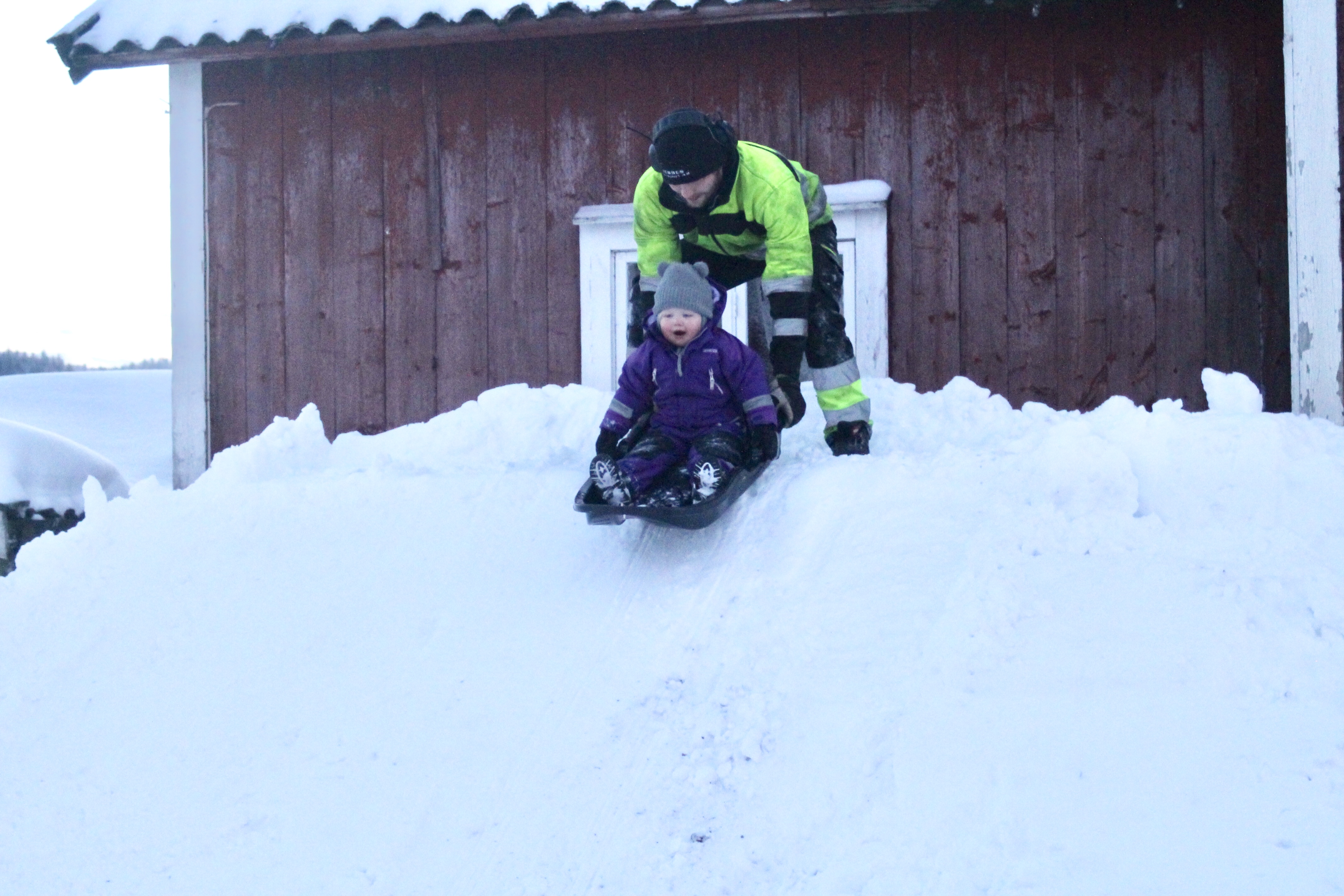 Vi hann vara ute en stund i ljuset med barnen på eftermiddagen. Att åka dyna utför en snöhög eller tolka efter en springande pappa det ger glädjetjutande barn. Ingen som antydde den bistra kylan.