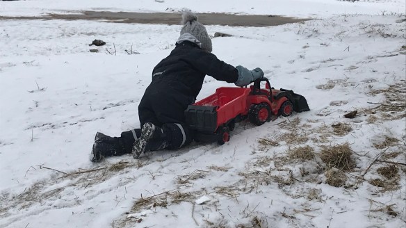 Lite snö har fallit (och mer ska det komma i veckan!) och någon som inte direkt suckar över det är Lilla P. Traktor, skopa och vagn har fullt jobb!