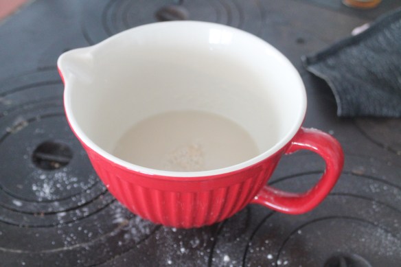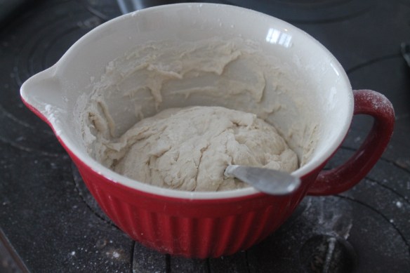 Värm vattnet fingervarmt, det ska vara lite varmare än ljummet men inte kokhett. Blanda vattnet med torrjäst, salt och socker och låt stå i 10 min tills det bildats lite skum på toppen av vätskan. Arbeta in mjölet i omgångar, degen ska vara lite kladdig. Du behöver inte knåda eller överarbeta den, så fort mjölet blandats in i degen är den klar.