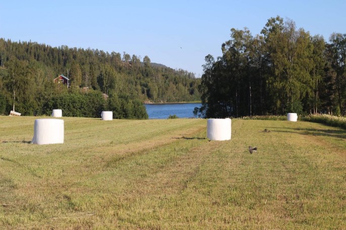 Medans jag har varit på Borta-gården och jobbat så har C varit på hemmaplan. Nu när vi inte har stora John Deeren kvar så har vi ingen traktor att slå med. Vi lejer då detta ekipage som jag visat i tidigare inlägg ( HÄR). Denna Butterfly slår 9 meter i ett svep och lägger ihop det till en tjock sträng. Effektivt att både slå ner gräset och bala det sedan. Nu har vi resten av fodret. Eller ja, det är fortfarande lite kvar men det ska tas ännu senare för ströbalar. Detta foder är lagom till de stora köttkorna. Får det bättre (tidigare skördat = mer näring) gräs så blir det vara feta och för feta djur vill man inte ha. Medans de tidigare fodret vi tagit kommer de yngre, växande djuren att få.