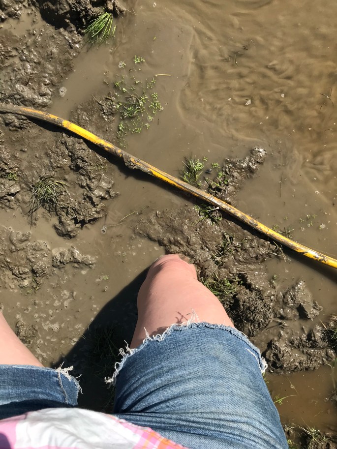 Jag behövde inte krypa genom vägtrumman i år. Men. C hade skurit av slangen i ren panik då det brann och de metrarna efter trumman ut på lägdan hade korna såklart trampat ner i bäcken och ja, lerhålet. Det var stört omöjligt att med handkraft dra upp den så det var bara att kliva ner. Grävde med händer och fötter i den knähöga, fastsugande gyttjan.