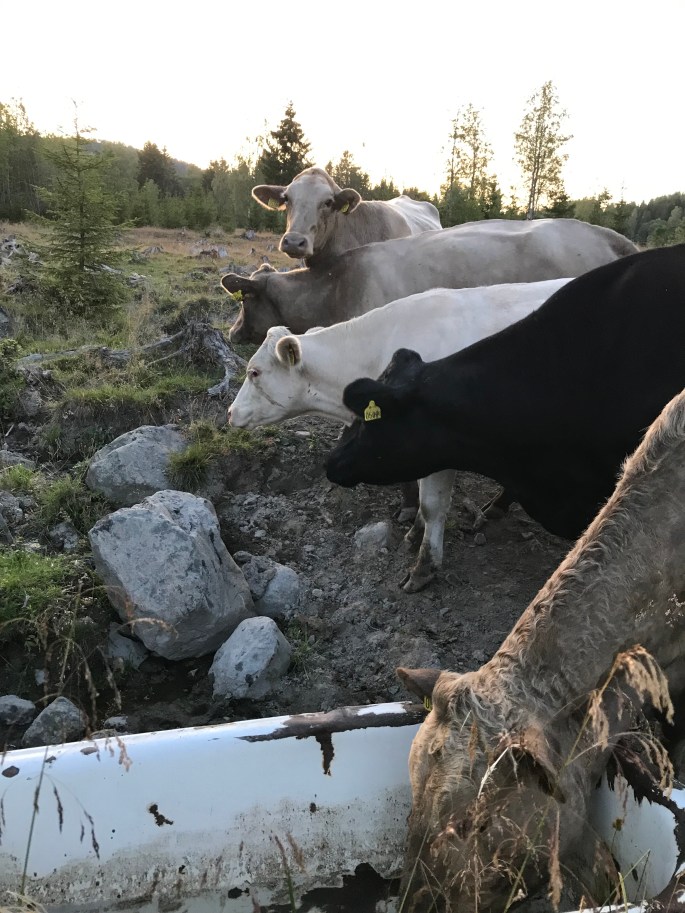 Igår gick jag nån timme tidigare också från Borta-jobbet, så kunde jag passa på att fixa vatten till hyggeskorna där bäcken börjar sina. Trots denna torka som nu kommer så har det funnits vatten där förvånansvärt länge i år.