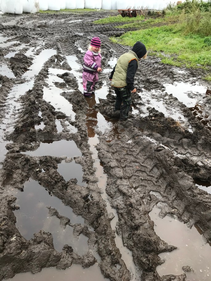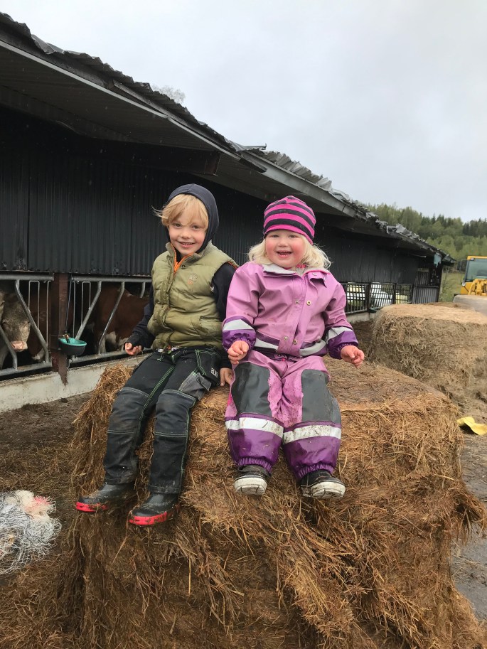 Trots regn och lera så kände jag mig alldeles lycklig. Till och med lillasyster var på bra humör under hela utevistelsen (hon med 14 000 utbrott om dagen nu annars…). Och se de där två tillsammans. Hur Lilla P visar och tar hand om henne när mamman kör och hämtar balar att ställa fram gör en så himla varm i hjärtat!