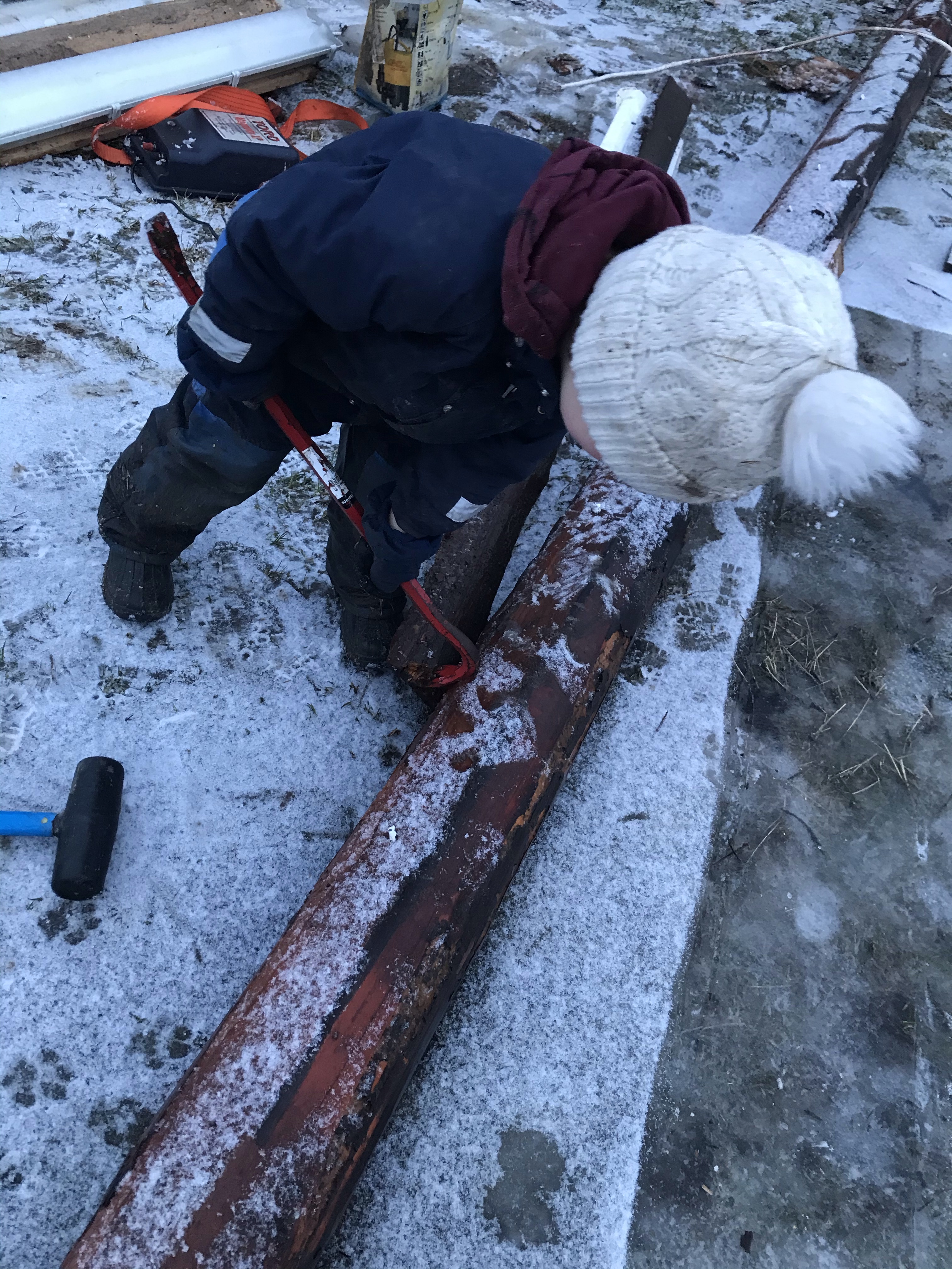 Idag har vi söndag, ett litet vitt täcke har lagt sig under natten och det är flera minusgrader. Ett sista ryck ska göras i den gamla ladugården för att bli klar att börja rivas till veckan. En vän har kommit med sin grävare så vi kan få omkull resten av den bastanta byggnaden.