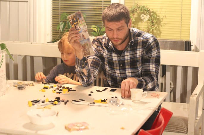 Födelsedagsmorgonen började med legobygge, som fanns i ett av paketen. Pappa C hade en helledig dag från borta-jobbet. Trots att det är ganska mycket tid borta nu för C, för och nackdelar med att han nattar över, så kan lyxen också vara att han kan planera in lediga dagar. Som när hans son fyller år och då kunna vara hemma hela dagen, mitt i veckan.
