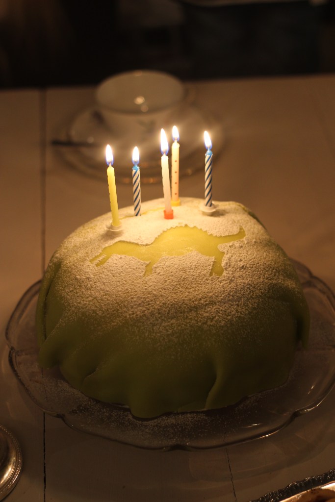 En önskan om dinosaurietårta. Spinosaurus skulle det vara! Den blev godkänd av födelsedagsbarnet och det är huvudsaken.