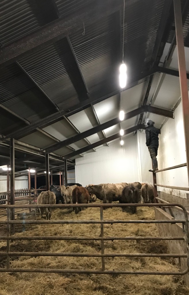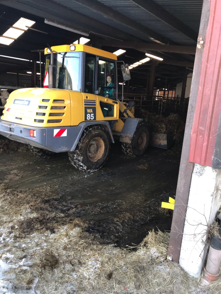 När det var klart på ena sidan var dagens andra uppdrag att tömma ena bädden. Det brukar gå, att köra hela innesäsongen innan djupströbädden måste tömmas och då gör vi det när vi släpper ut korna på bete på våren. Då kan man tömma lagårn i lugn och ro och helt utan djur.