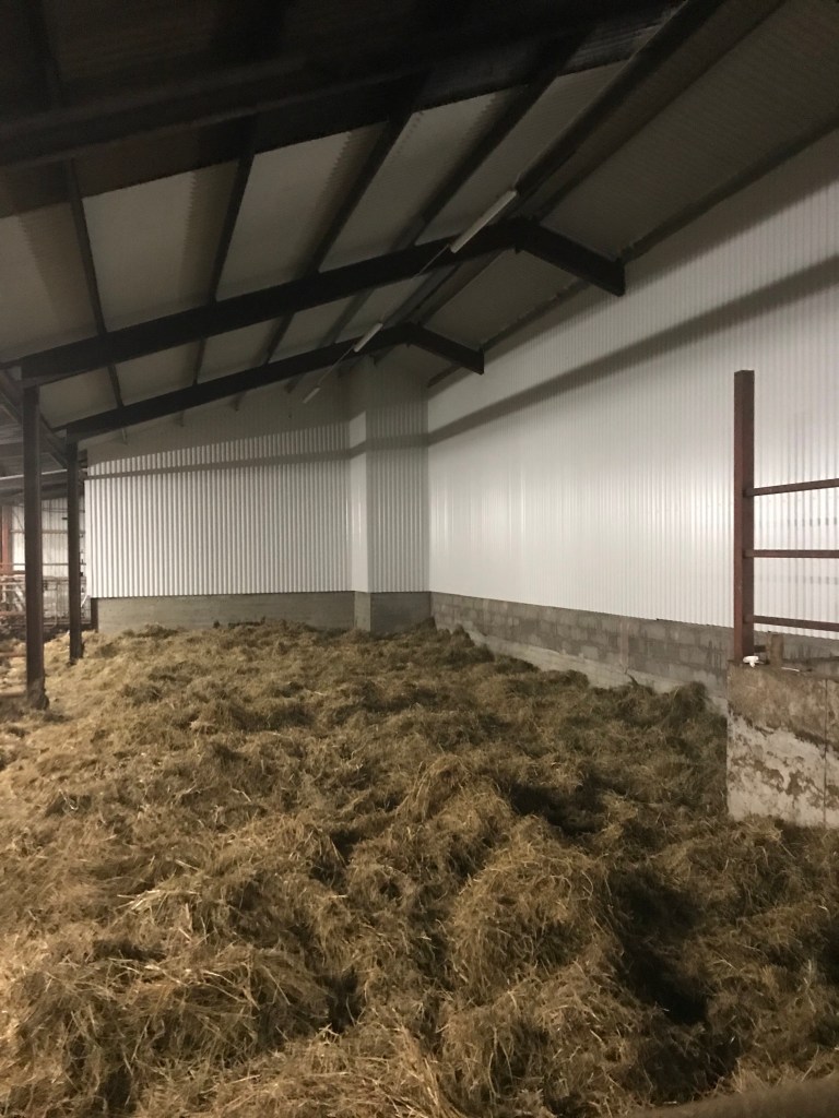 Öppningen med grinden här är slutet på skrapgången och till vänster i bild som inte syns är gödselplattan. Så vi skrapar med skopa rätt genom lagårn och rakt in på högen, så smidigt.