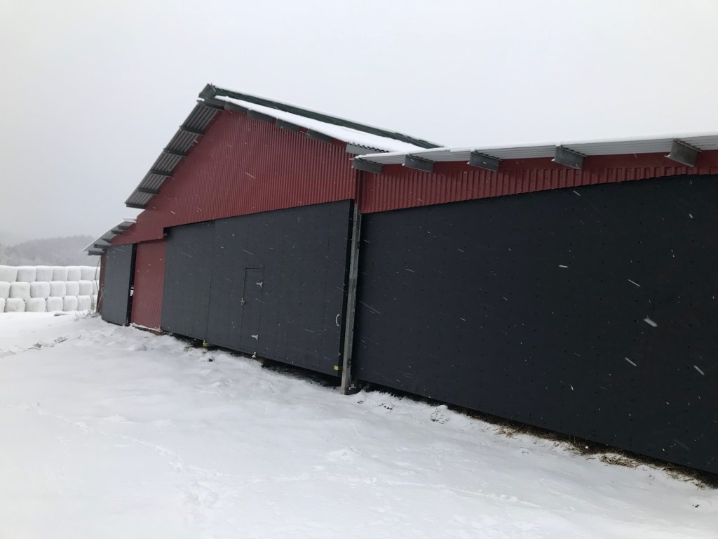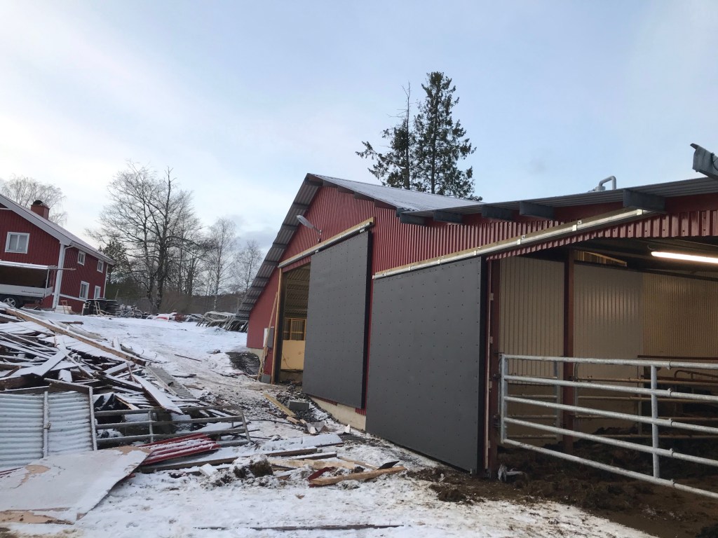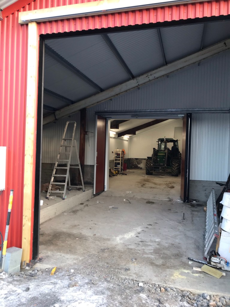 Och typ det bästa av allt, det man nästan gör leende dagligen nu är att öppna och stänga portar. SER ni så rejäla och fina!? De är byggda av snickarna. Ihopsvetsad stålram som sedan är brädslagen och med slätplåt utanpå. Och dessa tunga går nu på Nya rejäla skenor, lätt som en plätt, som hjulen inte kan hoppa ut ur! Vi är så löjligt glada över dessa alltså. Efter att ha haft plåtportar också med stålram men som gått på skenor som minsta lilla fått de att hoppa av! Det har gett många psykbryt när man står med ett spett och försöker lyfta de tunga asen på plats när man inte ser nånting. Eller med pallgafflar som gör att man skadar plåten och ja… Ni hör ju att det varit ett problem!