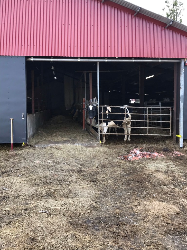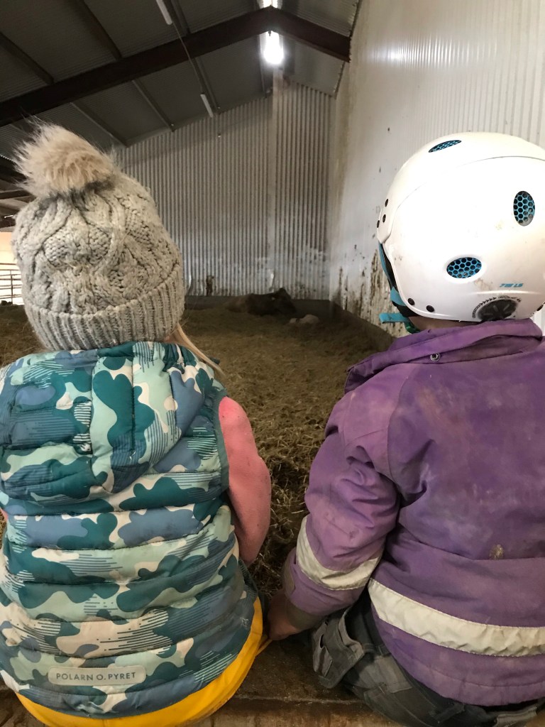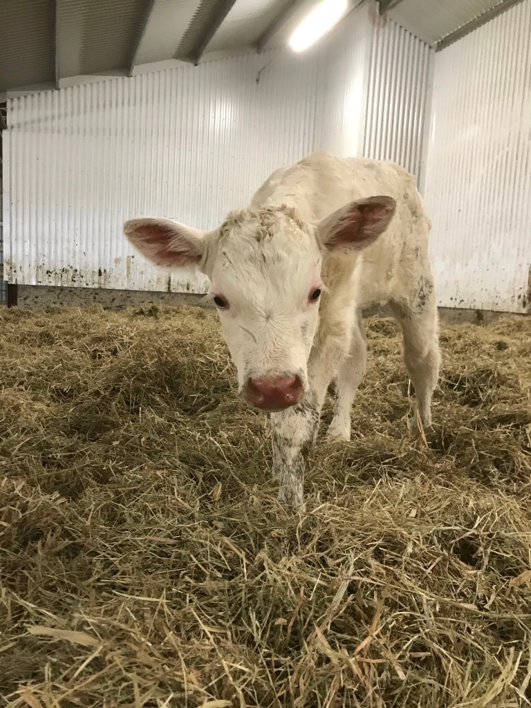 Och igår fick vi äntligen en till kalv! Barnen ville så gärna klappa men vi tar säkerheten ett steg längre när jag är ensam med barnen. Trots att kossan verkade hur snäll som helst så är det ändå en nykalvad köttko och då går jag inte i närheten i onödan. Så vi kikade på håll, helvit var den så barnen döpte den till Snövit.