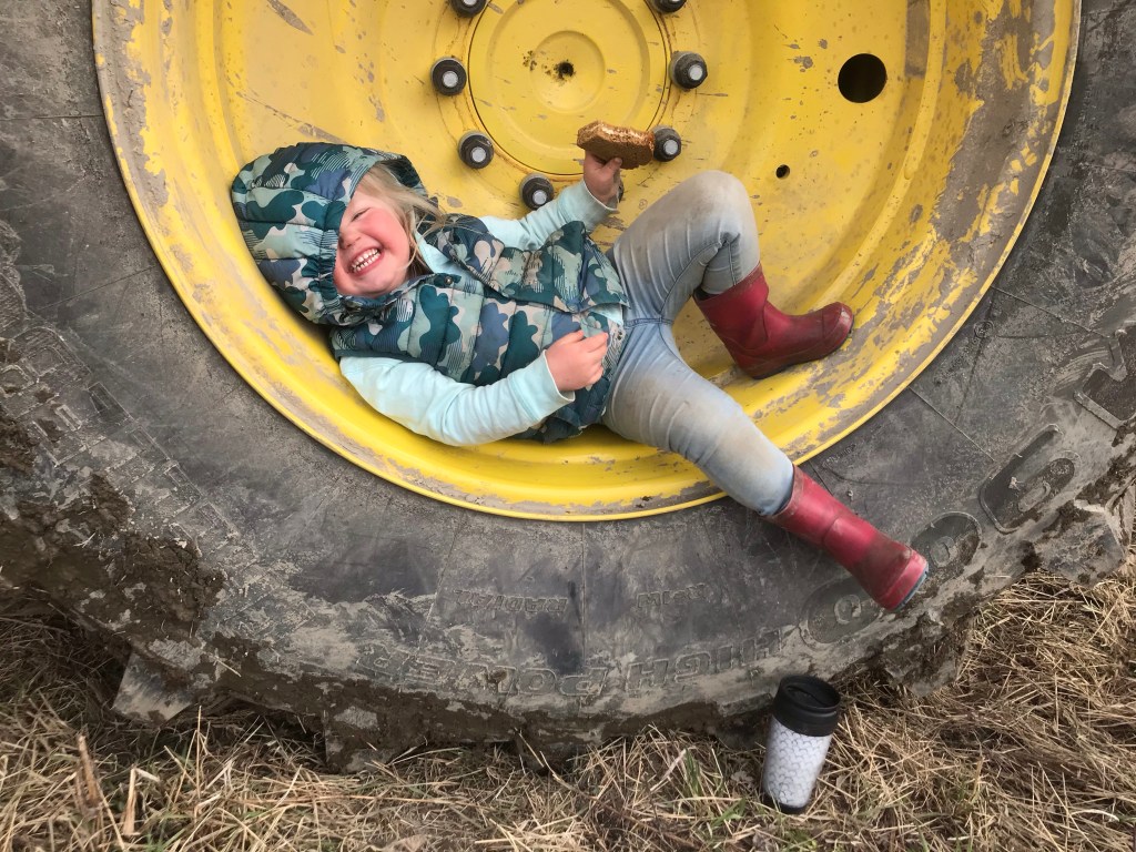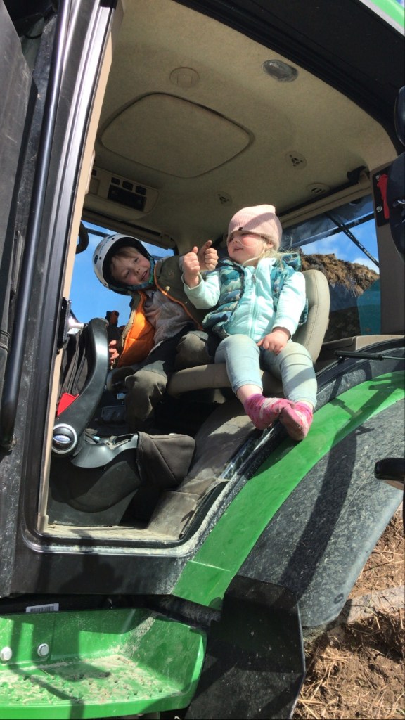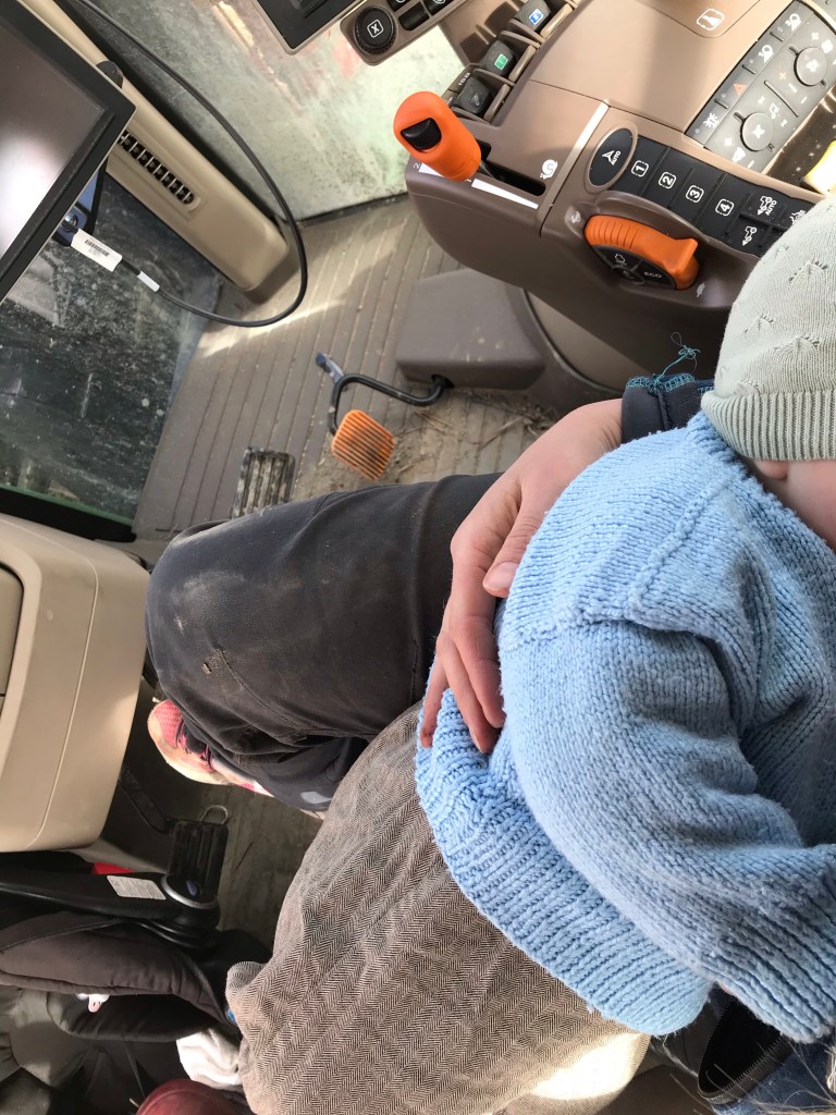 Triss i barn i den rymliga hytten men de där två stora hoppar emellan mamma och pappa som de känner för (eller vi vuxna skickar mellan den lilla surrkusen till treåring..). Jag sitter i stora hjullastaren och lastar på C som kör ut på åkern.