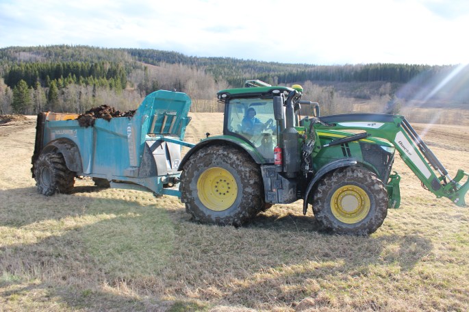 Vi inviger hela familjen med fastgödselkörning med inhyrd spridare och sproilans ny fin-traktor.