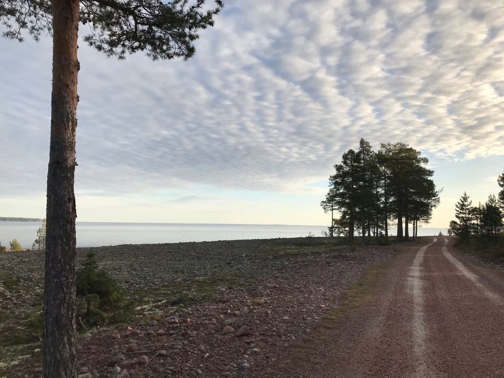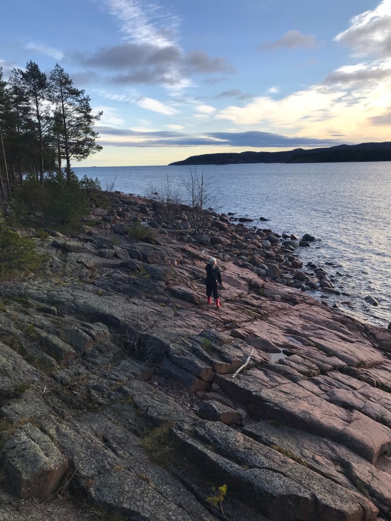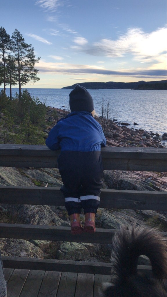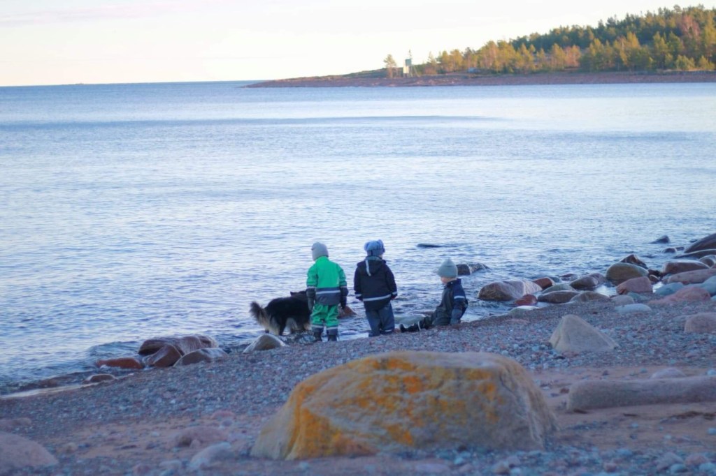 Vi gick till Måviken hela familjen. Hade ett paket kex med, varm choklad och hade tävling om vem som kastade sten längst i vattnet.
