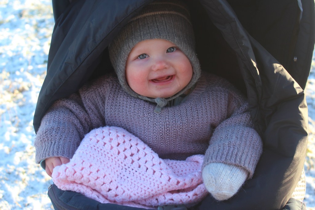 Gullrumpa i massor av hemstickat. Tröja, vantar och finfilten. Allt gjort av Gammelmormor såklart ❤️