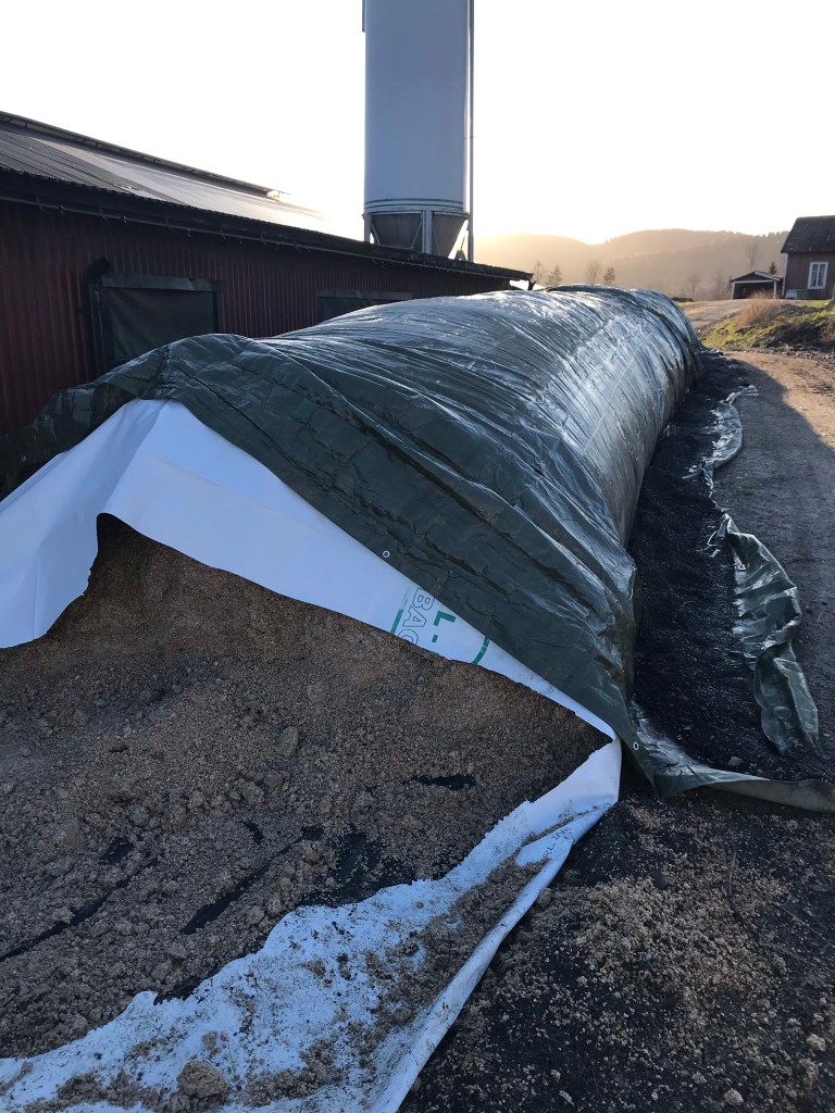 Vi har öppnat vetekorven som nu blivit ensilerad där inne och kossorna tycker att det är mums! Kul att det lyckades så bra med tröskning och kor packning!