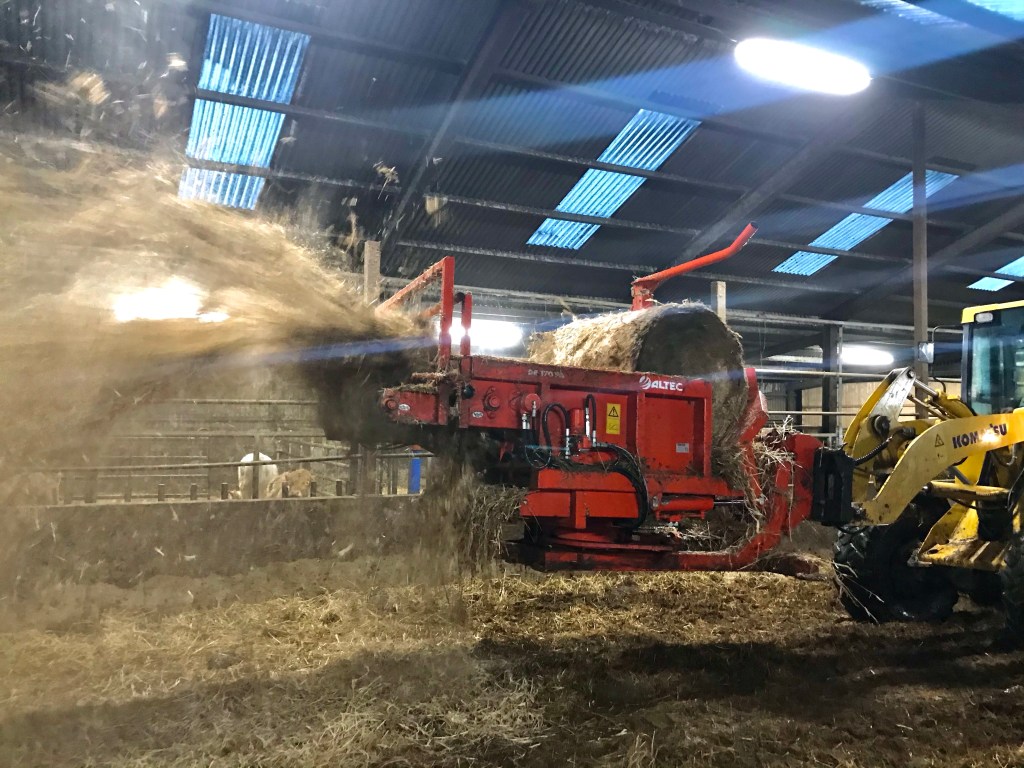 Förra året investerade vi i en ny strömaskin. Tidigare hade vi en trumma som satt bak på trepunkten. Det krävdes då en traktor till för att lasta i en halmbal. Vårt mål var att bara behöva starta och använda en enda traktor för att göra lagårn, skrapa, utfodra och ströa.