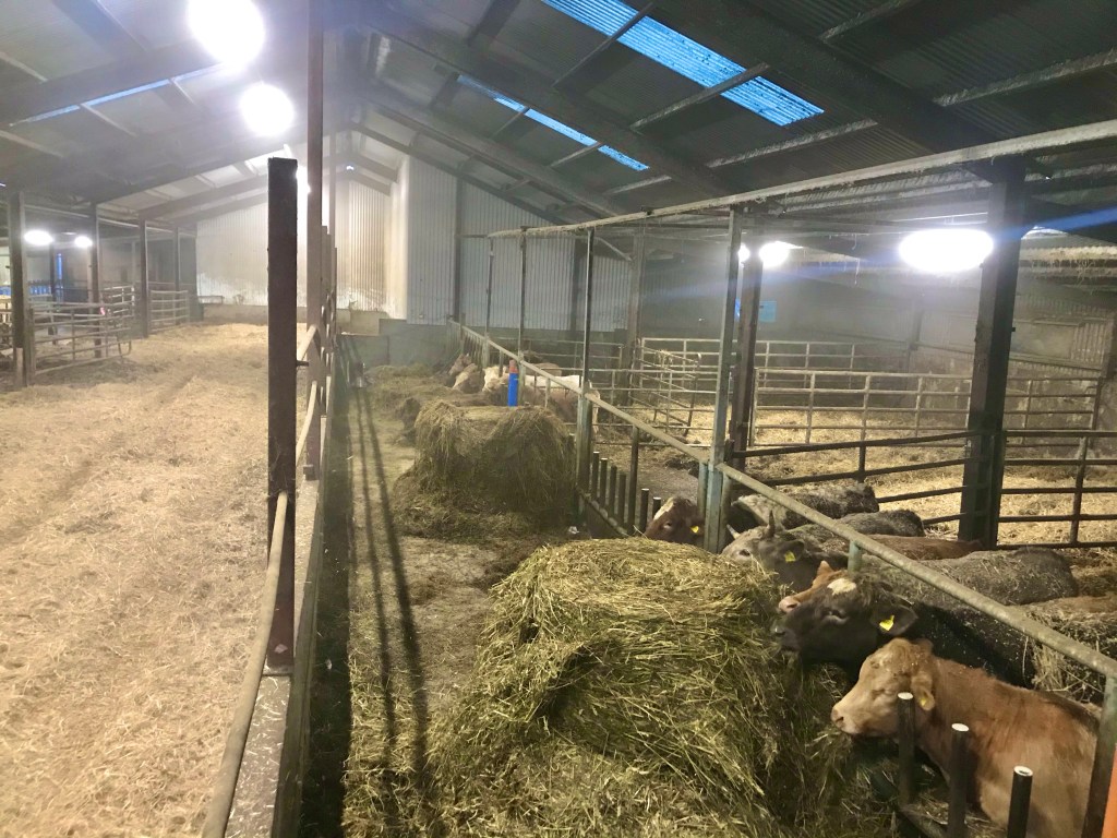 Vi har avsevärt mindre spill nu mot innan då utblåset satt lågt och vi var tvyngna att pricka mellan grindhålen. Det var även superkul för korna att stå mitt i vinddraget så det mesta av höet hamnade i en hög framför en ko.