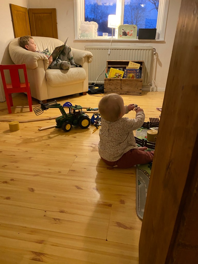 Men ut tar vi oss såklart varje dag ändå och när vi inte är ute i gegget och tittar till korna, skottar ensilage, kör fram balar, ströar så hänger vi i lekrummet, tränar i köket, städar i huset och påtar på inne.