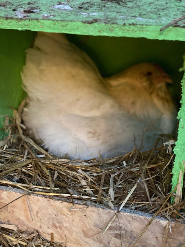 Vi går till hönsen. Fyller på mat och vatten, städar hönshus och jublar över att favoriten Stina lägger ägg!