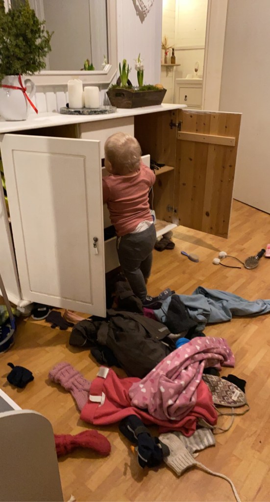 Sen har vi ”den här”. Vår älskade lilla Plutt. Hon som gör det hopplöst att ha ordning i allt som är en halvmeter övan golv. Skåp och lådor rivs och kastas det ur som om det vore en tävling! Tur hon är så förbenat söt där hon härjar fram från det ena skåpet till det andra!