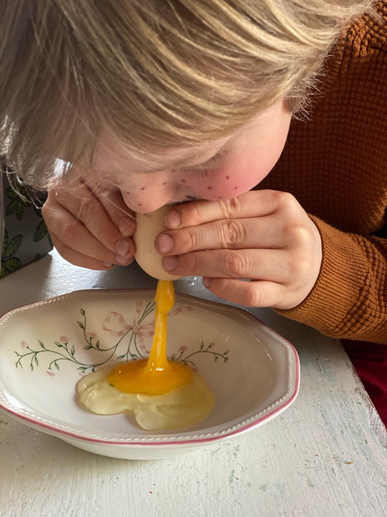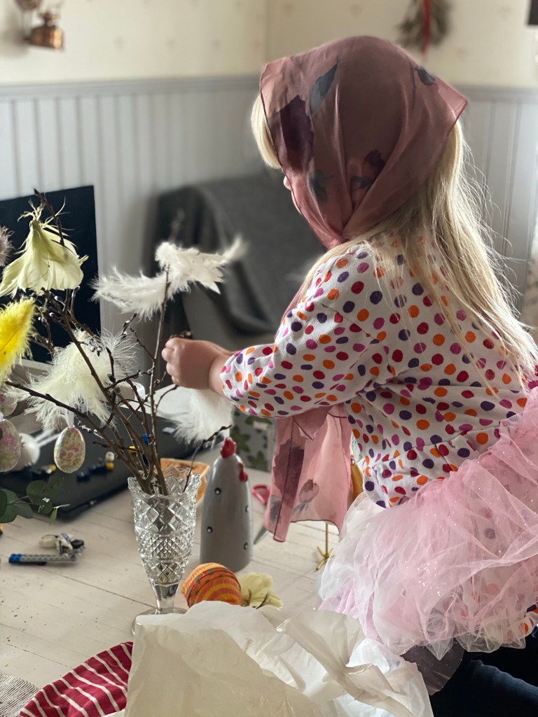 Påskkärringsgäng så pyntar ris, blåser ägg och letar ägg på gården.