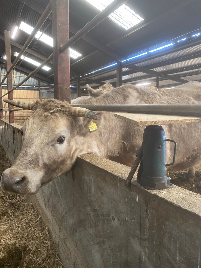 Det var även en väldigt intelligent ko som lirkade in sitt huvud och sina horn på ett väldigt bra ställe men kom sedan Inte därifrån… Suck. Hämtade en domkraft först för att prova om man kunde trycka upp röret ett par cm, om det kunde vara det avgörande att hon kunde ta sig ur. I alla fall prova det innan man tar till rondellen…