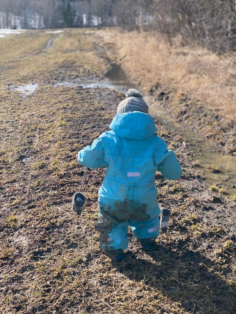 När sysslorna för dagen var klara en dag packade vi med oss eftermiddagsfikat och gick till ”pysselskogen”, lilla skogsdungen en liten promenad bort. Lerigt och dant men det bekommer ju inte dessa barn. Är det inte koskit så är det lera på de här barnen. Den där tvättmaskinen går varm här!