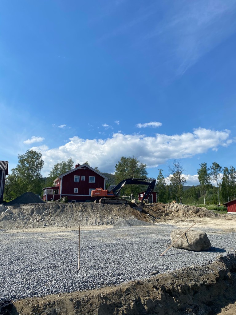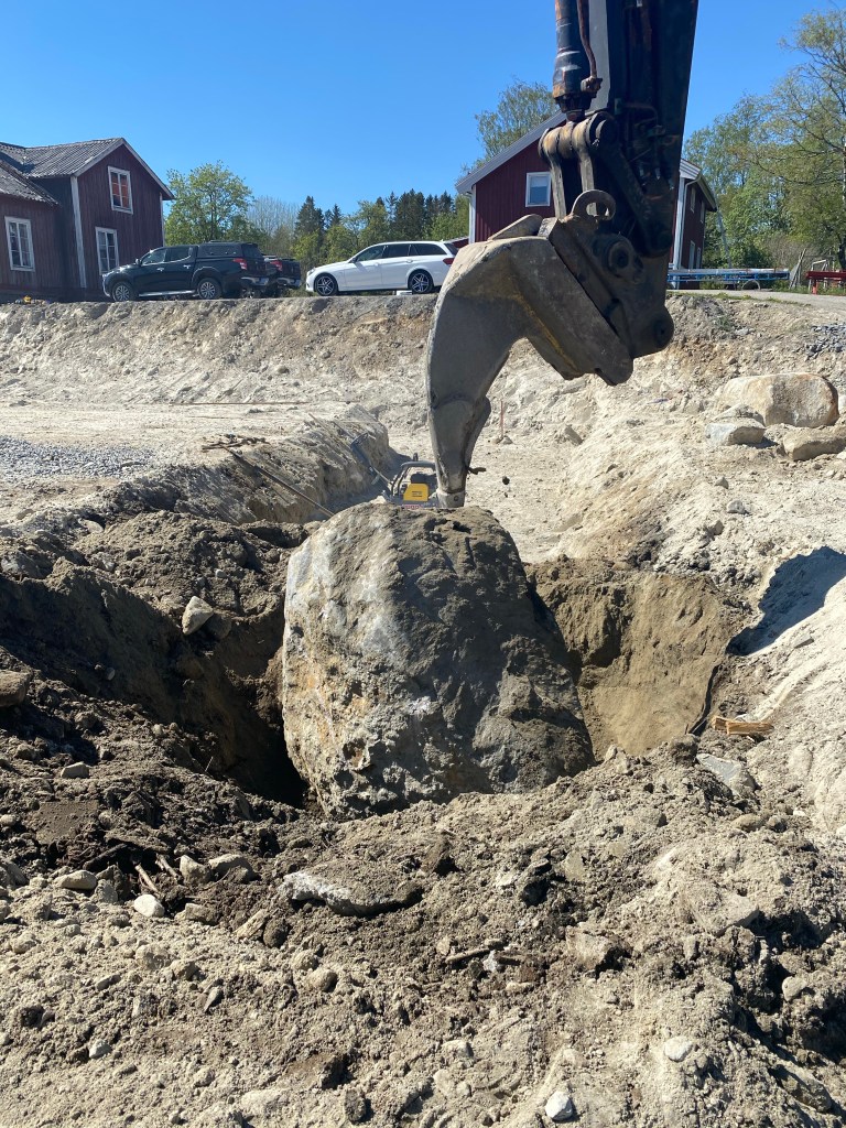 Denna väg har som sagt inte varit spikrak men nu är vi här, i startskedet av detta bygge. Våren har av bestått av schaktning, schaktning och lite mera schaktning. Vi har hård backe och inget berg – tack och lov! Men några rejäla storstenar har kommit upp!