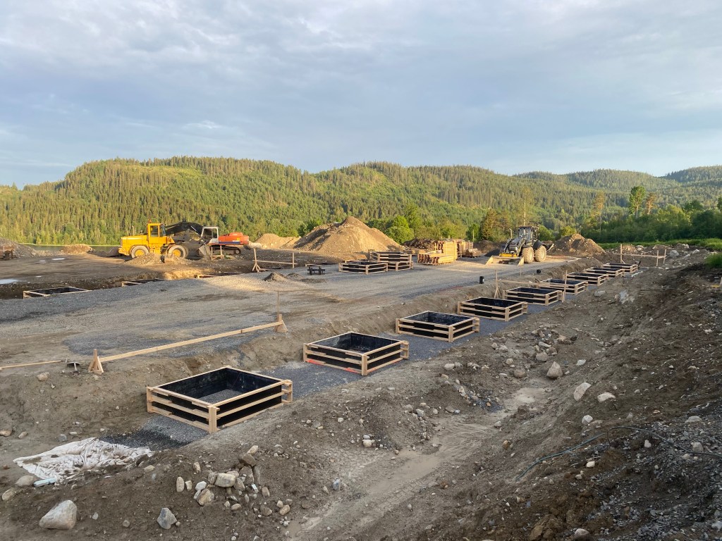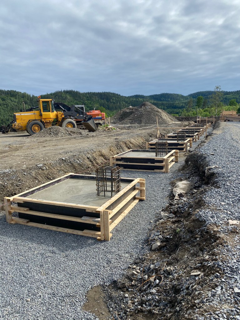 En ”vallgrav” har grävts ur och här har nu formar satts ner och första gjutningen hände idag! Grundsulorna gjuts på plats där ståltommen sedan ska stå.