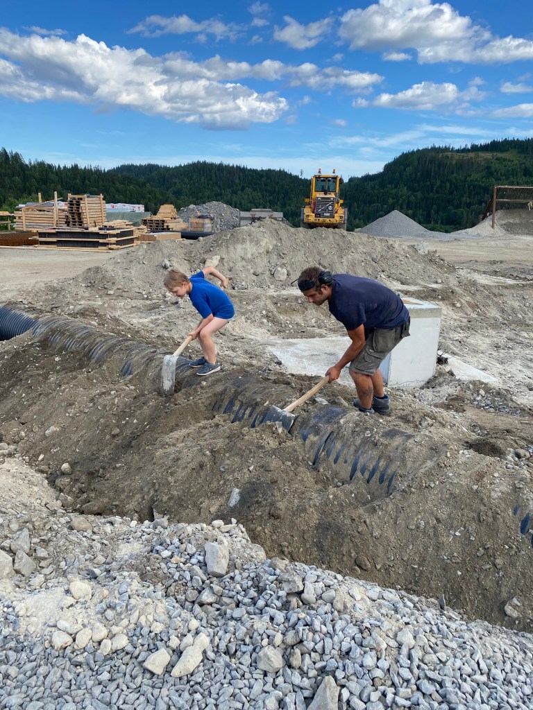 Barnen har haft en dag med moster med sambo och mormor och morfar så jag åkte dit och åt middag ikväll. C stannade hemma pga för mycket att hinna med. Så nu när barnen somnat har vi hjälpts åt med att fortsatta justera höjd på grusbädden.